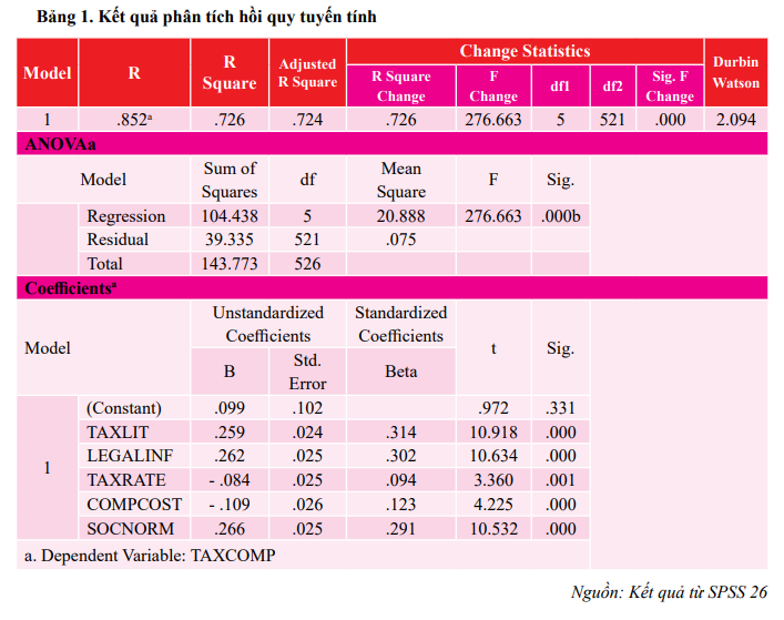 Sau khi các biến quan sát được gộp trung bình, mô hình hồi quy tuyến tính đa biến được thực hiện với TAXCOMP là biến phụ thuộc và năm biến độc lập (TAXLIT, SOCNORM, TAXRATE, COMPCOST, LEGALINF). Kết quả phân tích hồi quy tuyến tính như bảng 1 cho thấy 5 biến độc lập đều có ý nghĩa thống kê (Sig. < 0.05).