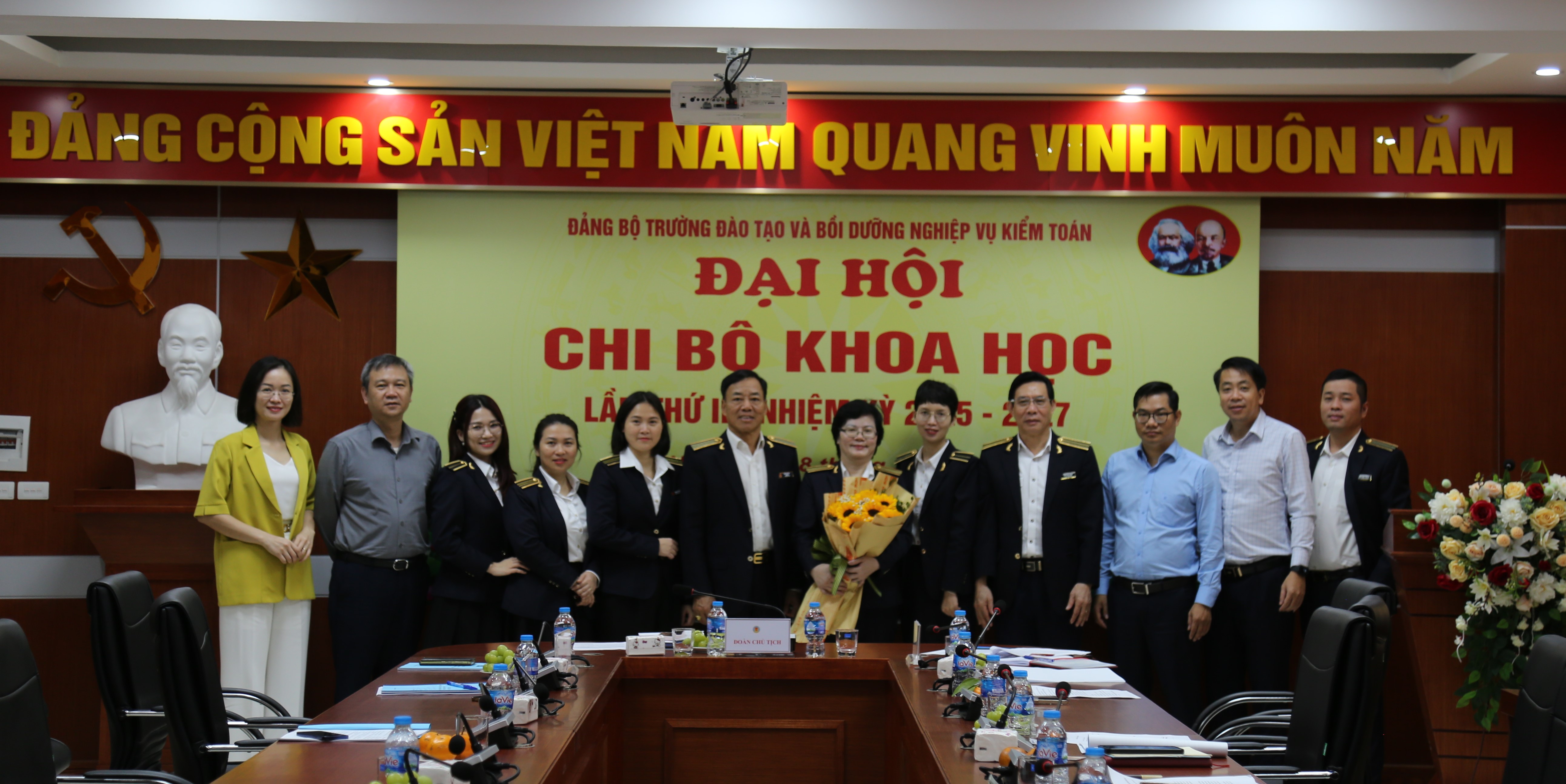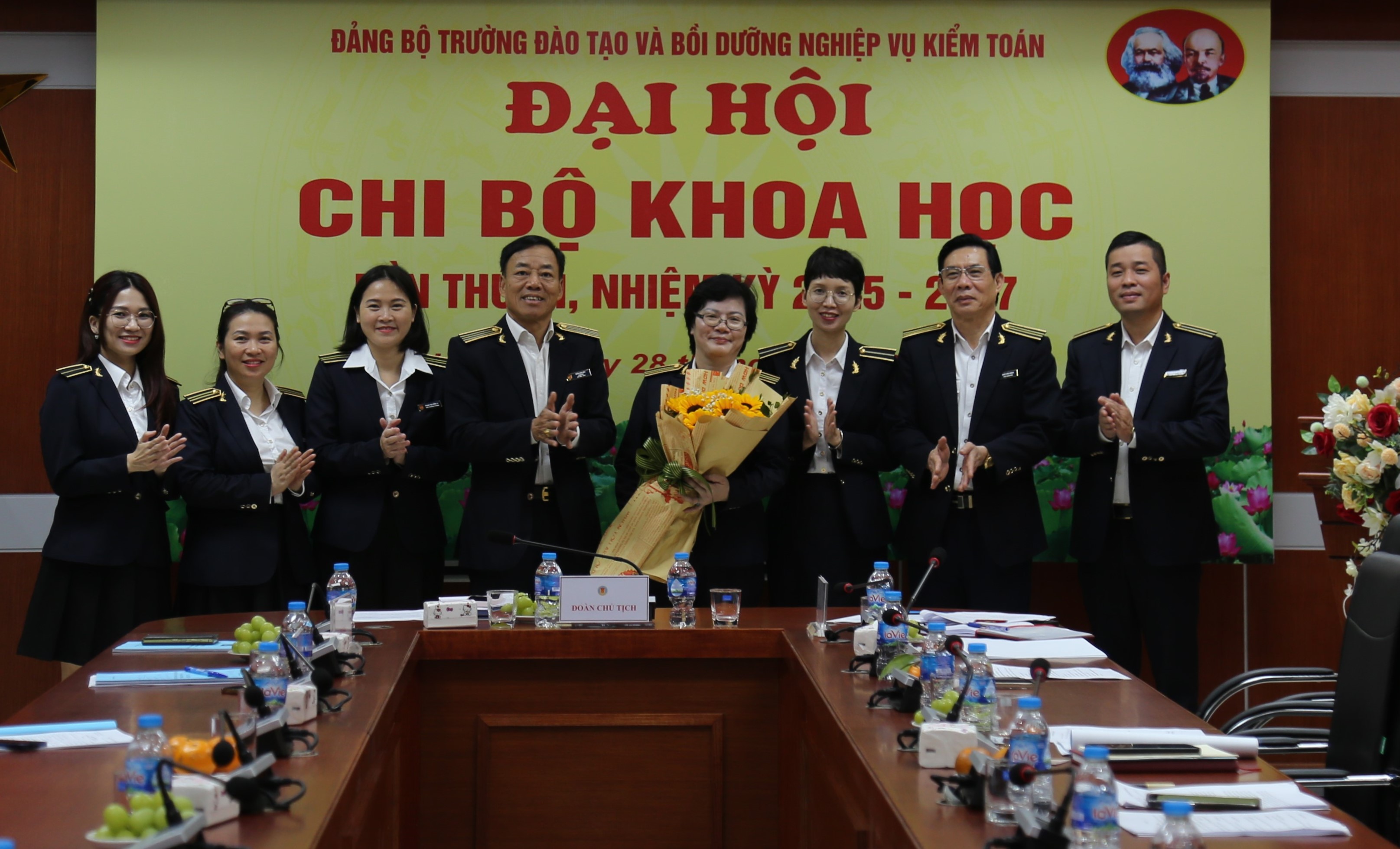 Đồng chí Trần Kim Lộc - Ủy viên BCH Đảng bộ Kiểm toán nhà nước, Bí thư Đảng bộ, Giám đốc Trường và đồng chí Ngô Văn Dũng -Phó Bí thư Đảng ủy, Phó Giám đốc Trường tặng hoa chúc mừng các đồng chí trúng cử vào Chi ủy Khoa học nhiệm kỳ 2025-2027. Chi bộ đã lãnh đạo công tác quản lý 73 đề tài các cấp trong đó có 01 đề tài khoa học công nghệ độc lập cấp Quốc gia, 46 đề tài cấp Bộ và 26 đề tài cấp Cơ sở. Đề tài khoa học công nghệ độc lập cấp Quốc gia: “Hoàn thiện pháp luật kiểm toán nhà nước nhằm nâng cao hiệu lực, hiệu quả phòng, chống tham nhũng, lãng phí ở Việt Nam” do Tổng Kiểm toán nhà nước Ngô Văn Tuấn làm chủ nhiệm đảm bảo yêu cầu về chất lượng và tiến độ, nghiệm thu xếp loại Xuất sắc. Từ kết quả nghiên cứu của đề tài NCKH cấp quốc gia đã biên soạn và phát hành cuốn sách: “Vai trò của Kiểm toán nhà nước trong việc nâng cao hiệu lực, hiệu quả phòng, chống tham nhũng, tiêu cực, lãng phí”. Các đề tài cấp Bộ và cấp Cơ sở đã bám sát tiến độ và đề cương, thuyết minh được duyệt, được nghiệm thu từ loại Đạt yêu cầu trở lên, không để xẩy ra tình trạng đề tài quá hạn.