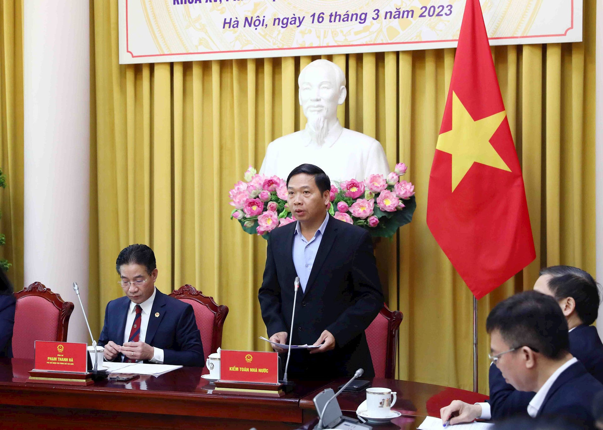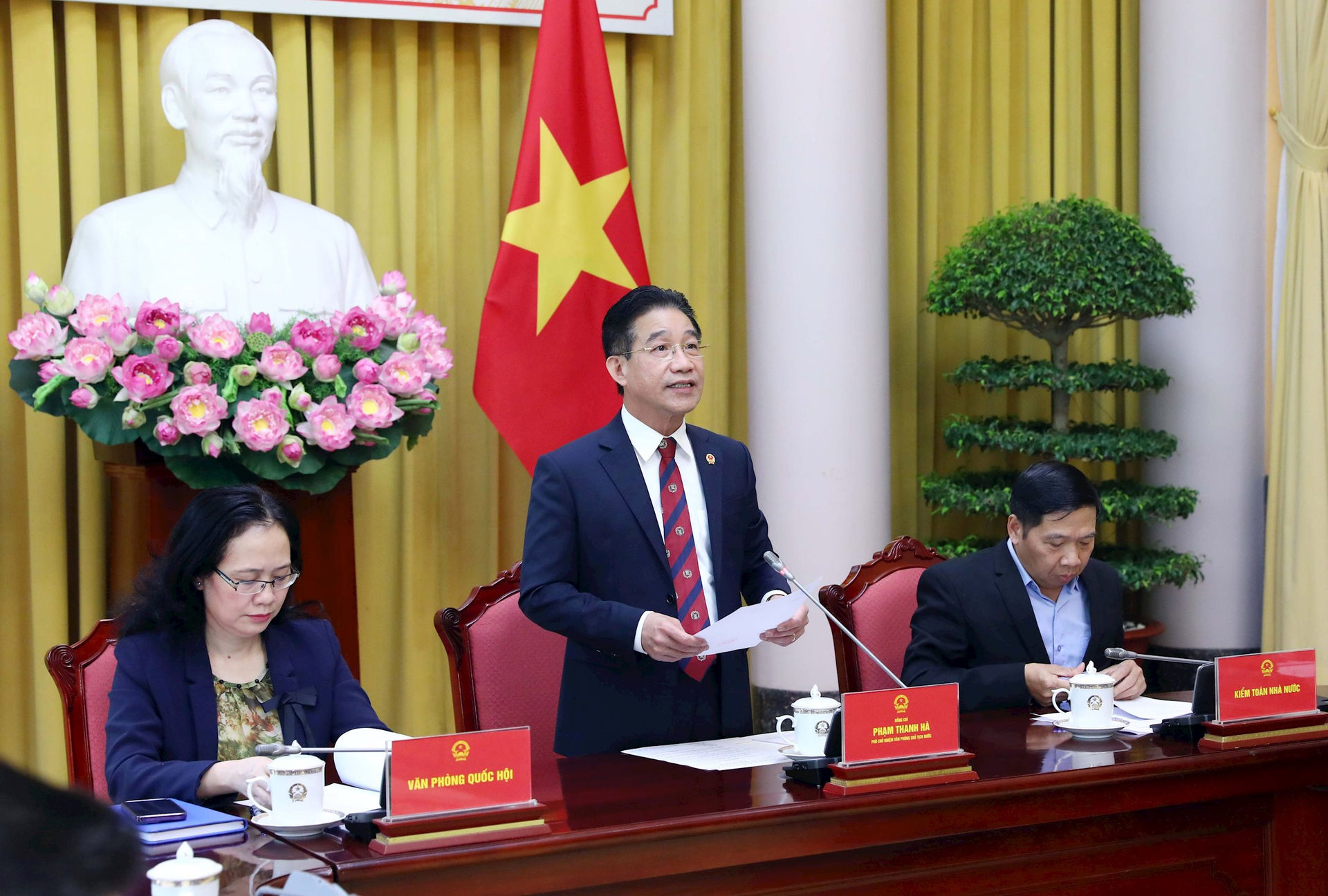 Phó Chủ nhiệm Văn phòng Chủ tịch nước Phạm Thanh Hà công bố Lệnh của Chủ tịch nước về công bố Pháp lệnh Xử phạt vi phạm hành chính trong lĩnh vực KTNN. Ảnh: HUY THÀNH Phó Chủ nhiệm Văn phòng Chủ tịch nước Phạm Thanh Hà, Phó Chủ nhiệm Văn phòng Quốc hội Nguyễn Thị Thúy Ngần, Phó Tổng Kiểm toán nhà nước Đặng Thế Vinh đồng chủ trì Họp báo.