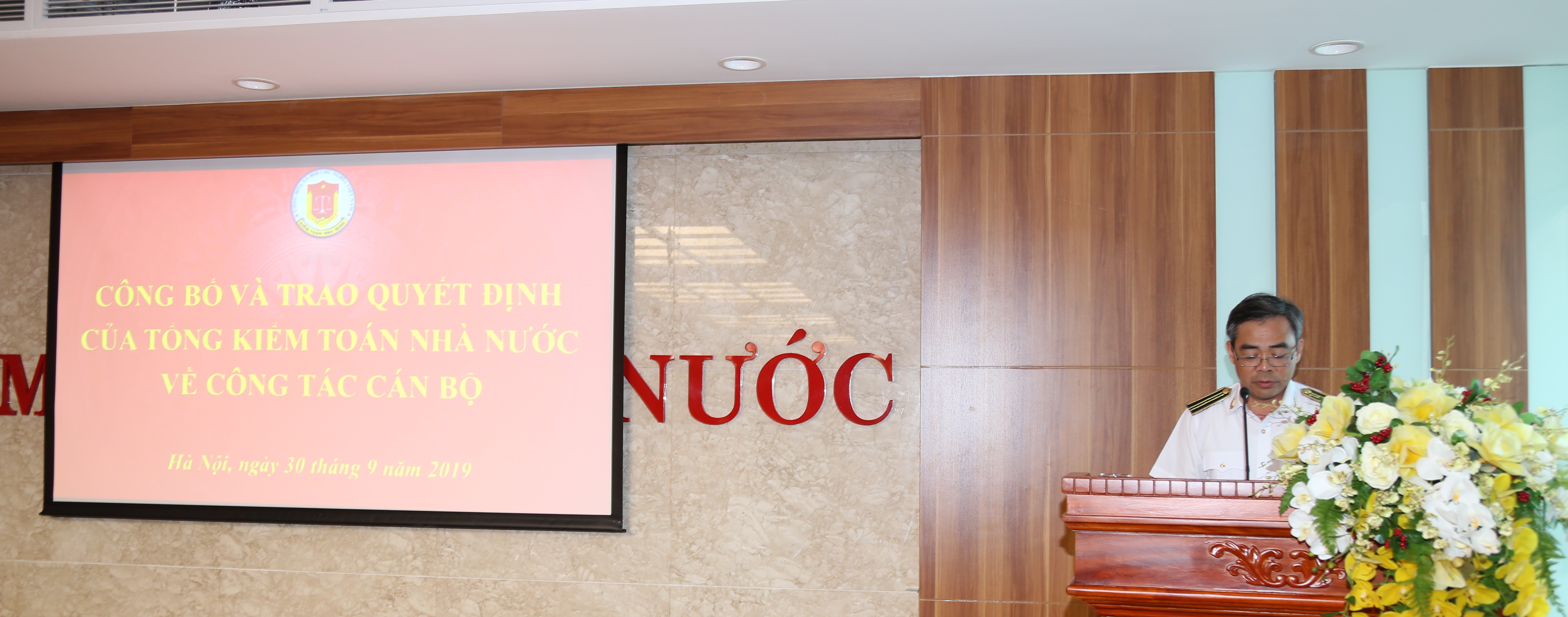 GS.TS Đoàn Xuân Tiên, Phó Tổng KTNN tặng hoa cho PGS.TS Nguyễn Đình Hòa Tại buổi Lễ, ông Nguyễn Mạnh Cường - Phó Vụ trưởng Vụ Tổ chức Cán bộ đã công bố Quyết định số Số 1646/QĐ-KTNN, ngày 30/9/2019 của Tổng KTNN về việc điều động bổ nhiệm ông Lê Minh Nam - Phó Kiểm toán trưởng KTNN chuyên ngành VI về giữ chức vụ Giám đốc Trường ĐT&BD nghiệp vụ kiểm toán kể từ ngày 01/10/2019, ông Lê Minh Nam được hưởng phụ cấp chức vụ 1,0, thời hạn bổ nhiệm 5 năm, kể từ ngày 01/10/2019.