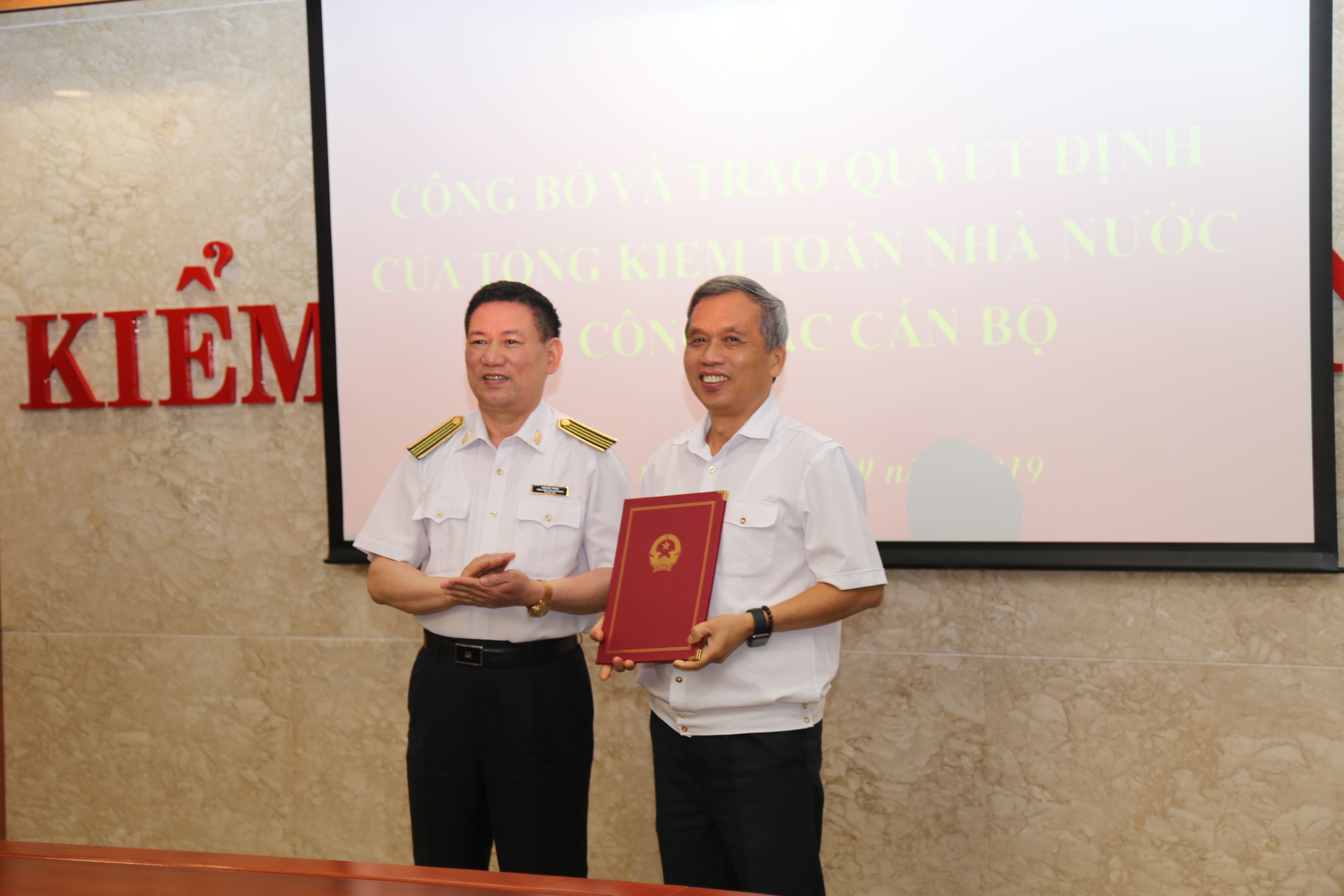 (khoahockiemtoan.vn) - Ngày 30/9/2019, tại trụ sở 116, Nguyễn Chánh, Hà Nội, Kiểm toán nhà nước (KTNN) tổ chức công bố trao Quyết định nghỉ hưu hưởng chế độ bảo hiểm xã hội đối với PGS.TS Nguyễn Đình Hòa, Q.Giám đốc Trường ĐT&BD nghiệp vụ kiểm toán(Trường) và công bố Quyết định điều động bổ nhiệm ông Lê Minh Nam - Phó Kiểm toán trưởng KTNN chuyên ngành VI về làm Giám đốc Trường ĐT&BD nghiệp vụ kiểm toán. Đến dự, buổi Lễ công bố có TS. Hồ Đức Phớc, Ủy viên Trung ương Đảng, Tổng KTNN, GS.TS Đoàn Xuân Tiên, Phó Tổng KTNN, đại diện Lãnh đạo cấp vụ các đơn vị trực thuộc KTNN và toàn thể cán bộ viên chức, người lao động của Trường.