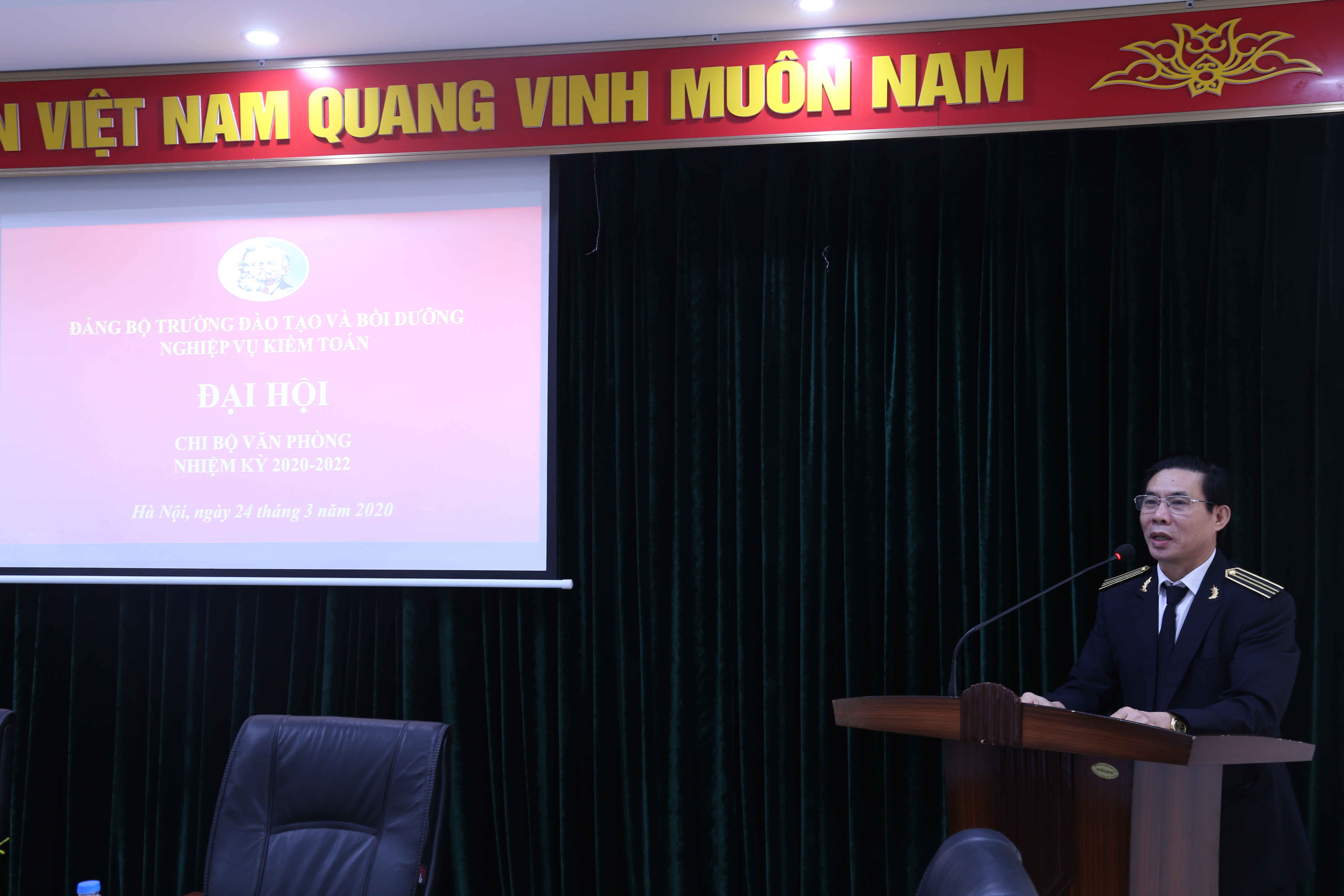 (khoahockiemtoan.vn) - Ngày 24/3/2020, Chi bộ Văn phòng Trường ĐT&BD nghiệp vụ kiểm toán (Trường) tổ chức Đại hội nhiệm kỳ 2020-2022, đến dự Đại hội có ông Lê Minh Nam - Bí thư Đảng ủy, Giám đốc Trường; ông Nguyễn Huy Hoàng, ông Ngô Văn Dũng Phó Giám đốc Trường và toàn thể Đảng viên Chi bộ Văn phòng Trường.