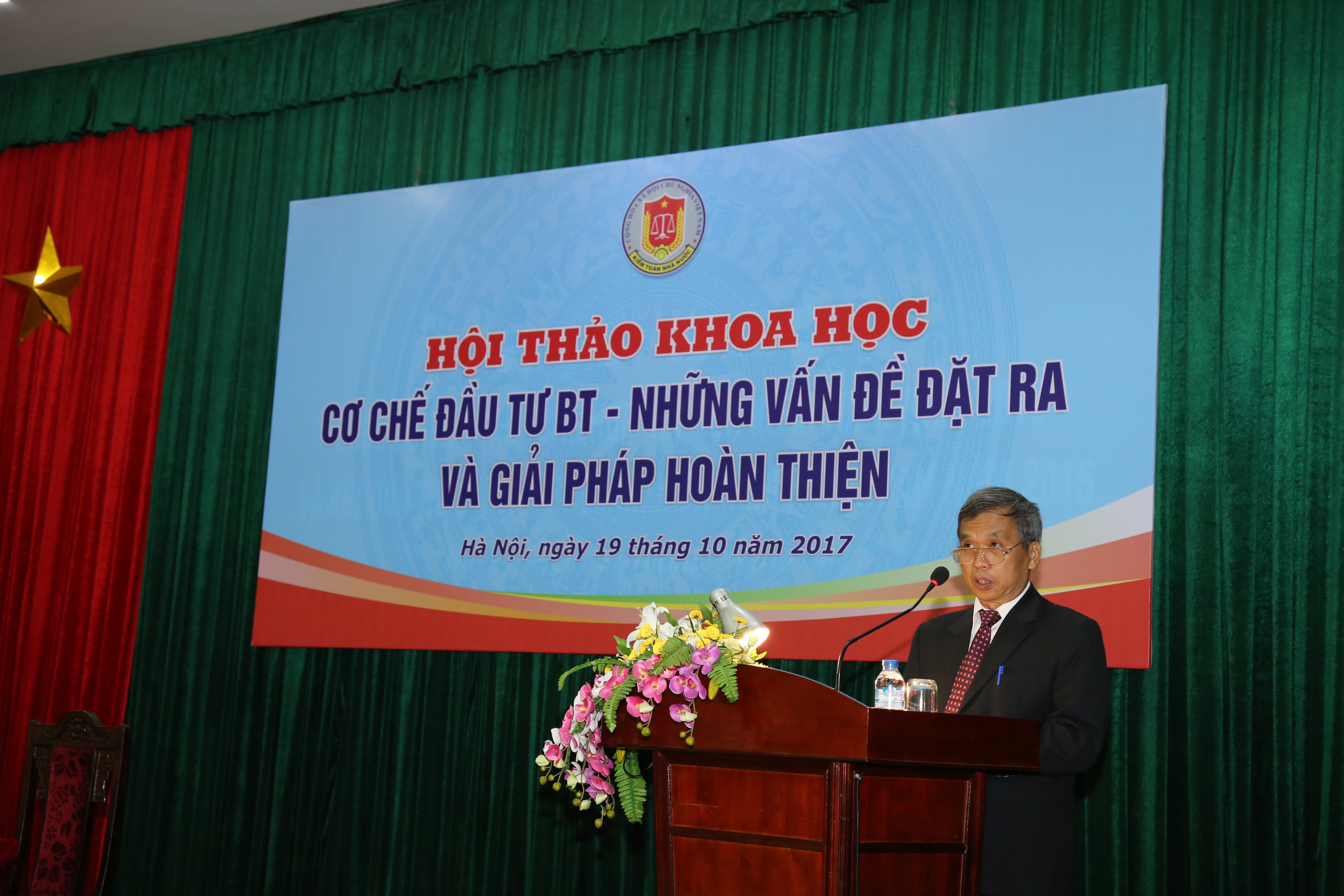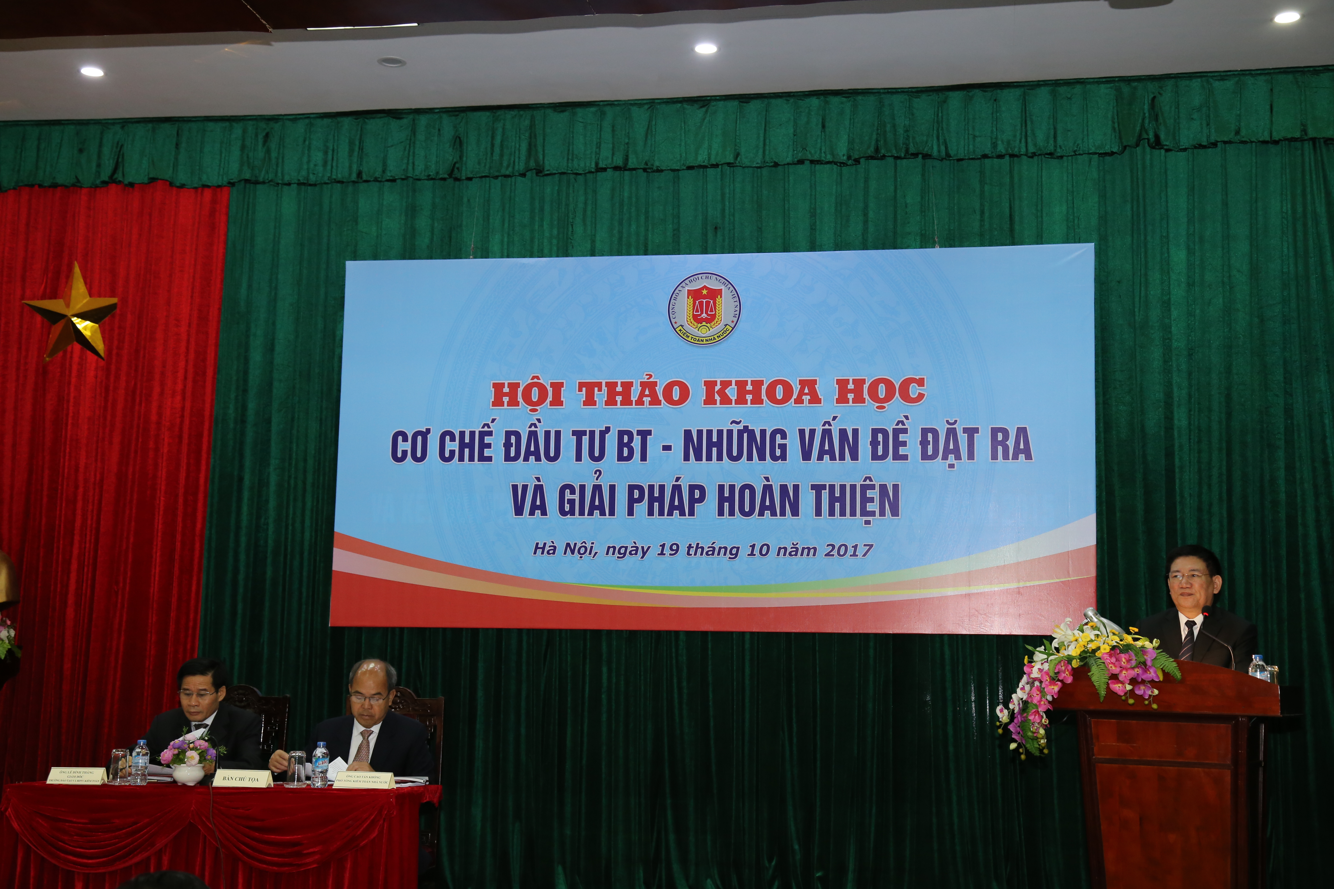 (khoahockiemtoan.vn) - Với mục đích phân tích, trao đổi quan điểm và làm rõ bản chất của các dự án BT hiện nay và cơ sở pháp lý kiểm toán các dự án BT của KTNN; đánh giá thực trạng các dự án BT; thực trạng công tác kiểm toán dự án BT của KTNN và đề xuất các giải pháp về cơ chế, chính sách nhằm nâng cao hiệu quả các dự án BT, sáng 19/10/2017, Kiểm toán nhà nước đã tổ chức Hội thảo khoa học “Cơ chế đầu tư BT – những vấn đề đặt ra và giải pháp hoàn thiện”. Tới dự Hội thảo có Tổng Kiểm toán nhà nước Hồ Đức Phớc, các Phó Tổng Kiểm toán nhà nước Cao Tấn Khổng, Vũ Văn Họa, đại diện các đơn vị trong toàn ngành, cũng như đại diện các cơ quan của Đảng, Quốc hội, Chính phủ, các Bộ, Ngành, cơ quan Trung ương, Hội nghề nghiệp, các Trường Đại học, Viện nghiên cứu, các Tập đoàn, Tổng công ty và các chuyên gia, các nhà khoa học. Phó Tổng KTNN Cao Tấn Khổng và TS.Lê Đình Thăng - Giám đốc Trường ĐT&BD nghiệp vụ Kiểm toán chủ trì buổi Hội thảo.