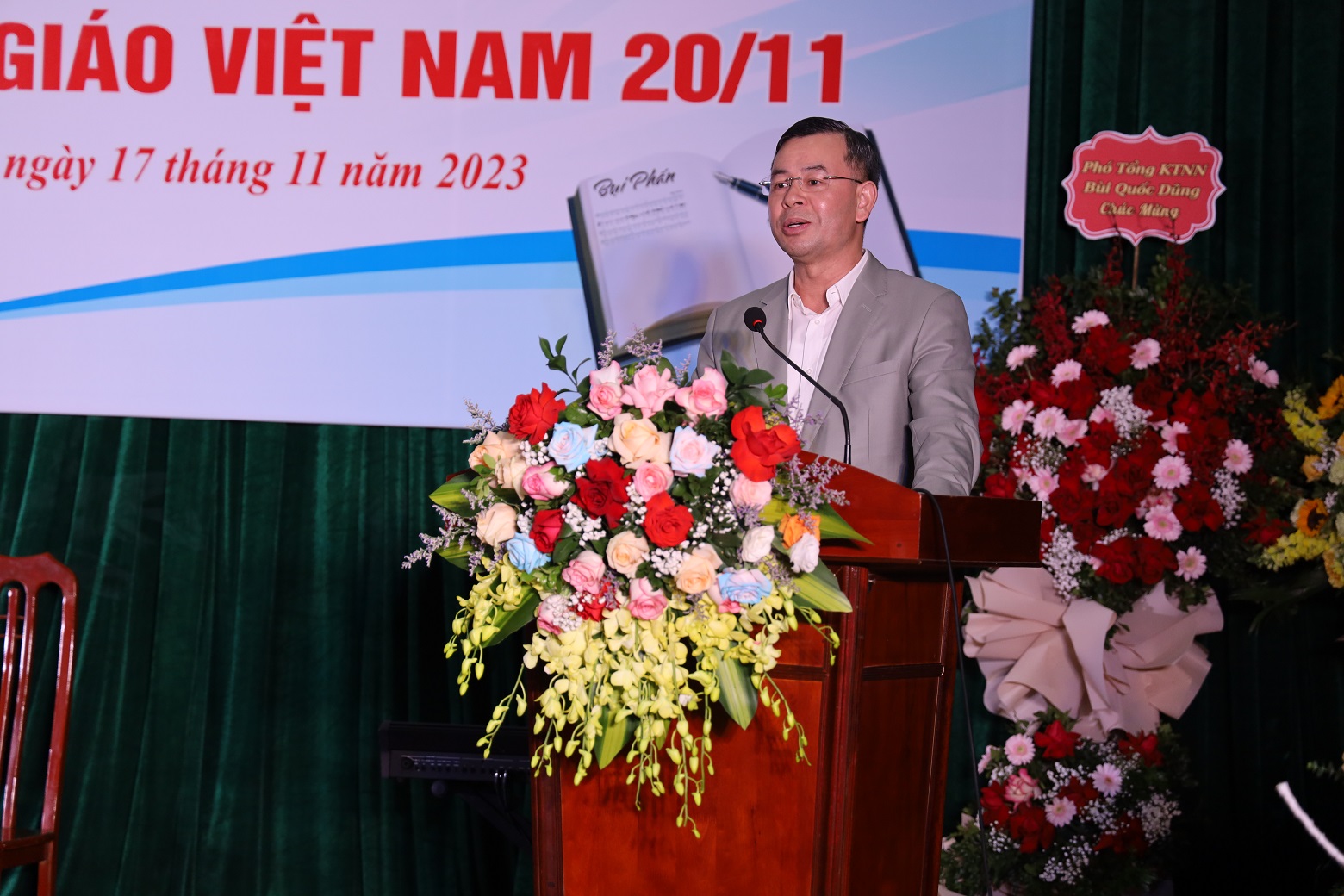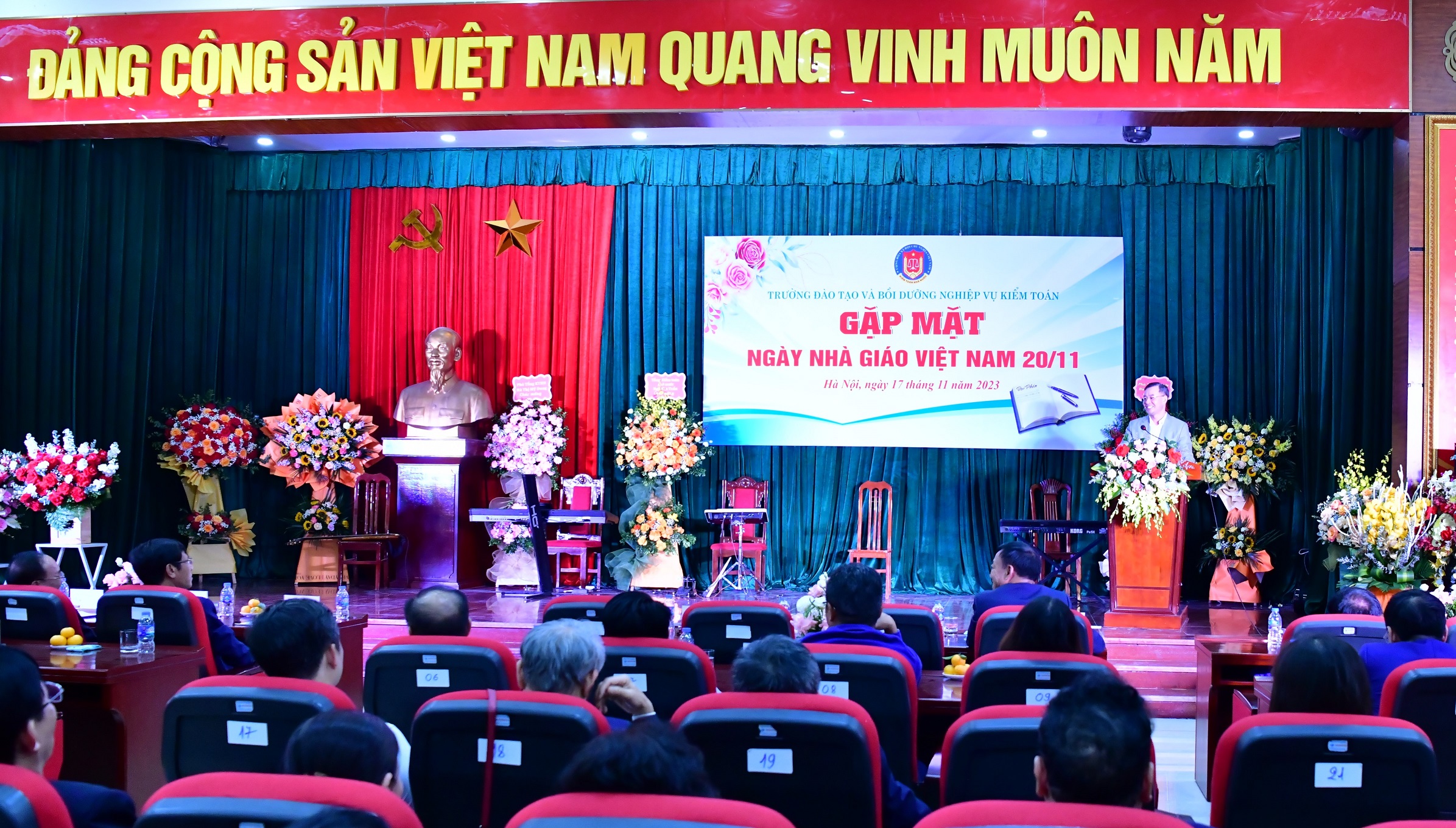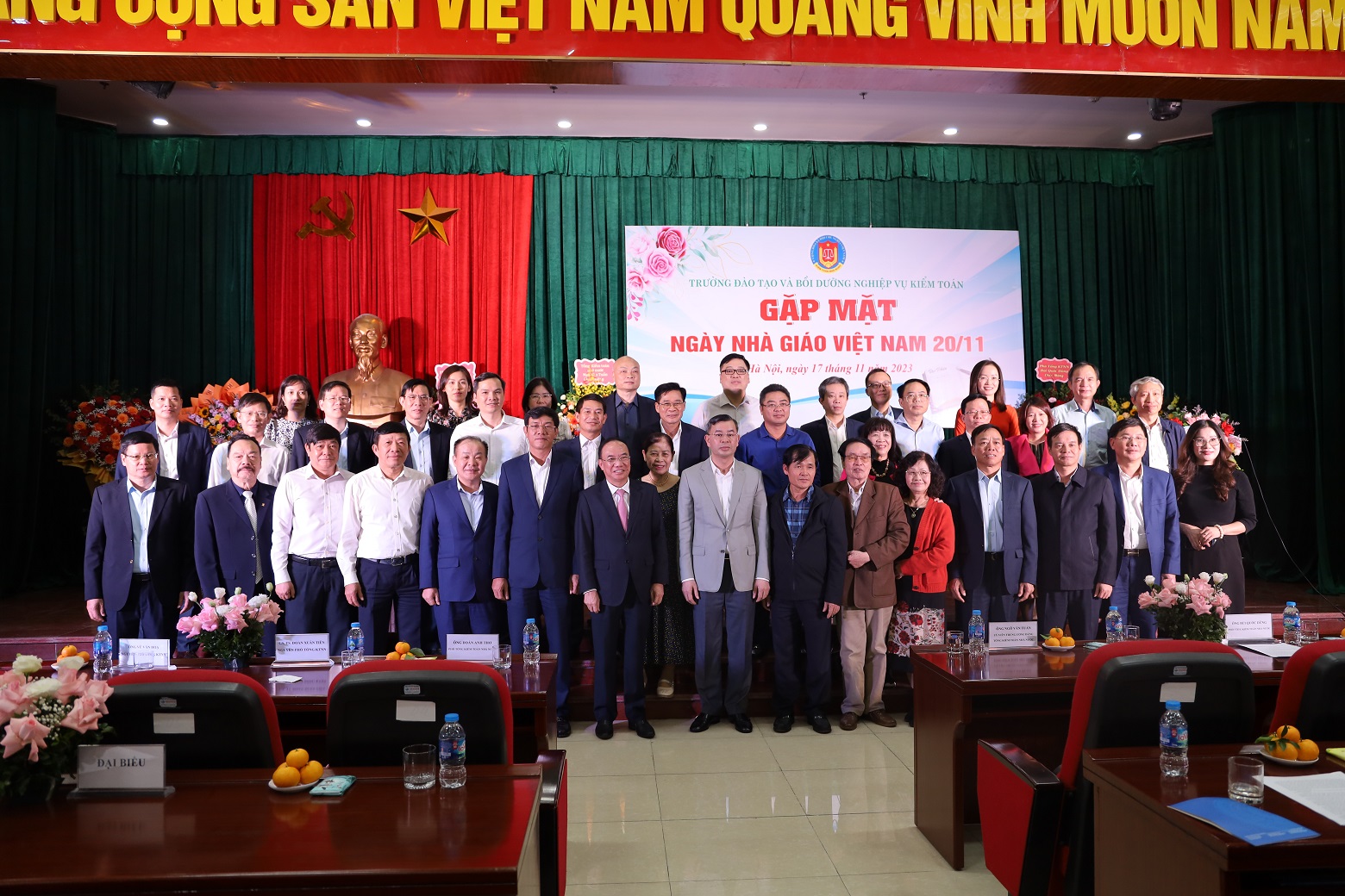 (khoahockiemtoan.vn) - Chiều 17/11, Trường Đào tạo và Bồi dưỡng nghiệp vụ kiểm toán (Trường) đã tổ chức Gặp mặt Ngày Nhà giáo Việt Nam 20/11. Tổng Kiểm toán nhà nước Ngô Văn Tuấn tham dự và gửi lời tri ân đến các thầy giáo, cô giáo, đội ngũ lãnh đạo, quản lý, viên chức, người lao động của Trường. Cùng tham dự buổi Gặp mặt có các Phó Tổng Kiểm toán nhà nước Doãn Anh Thơ, nguyên Phó Tổng Kiểm toán nhà nước Đoàn Xuân Tiên, Vũ Văn Họa; đại diện lãnh đạo các đơn vị trực thuộc KTNN; các thế hệ lãnh đạo, cựu giáo chức, cùng toàn thể các thầy giáo, cô giáo, đội ngũ lãnh đạo, quản lý, viên chức và người lao động của Trường.