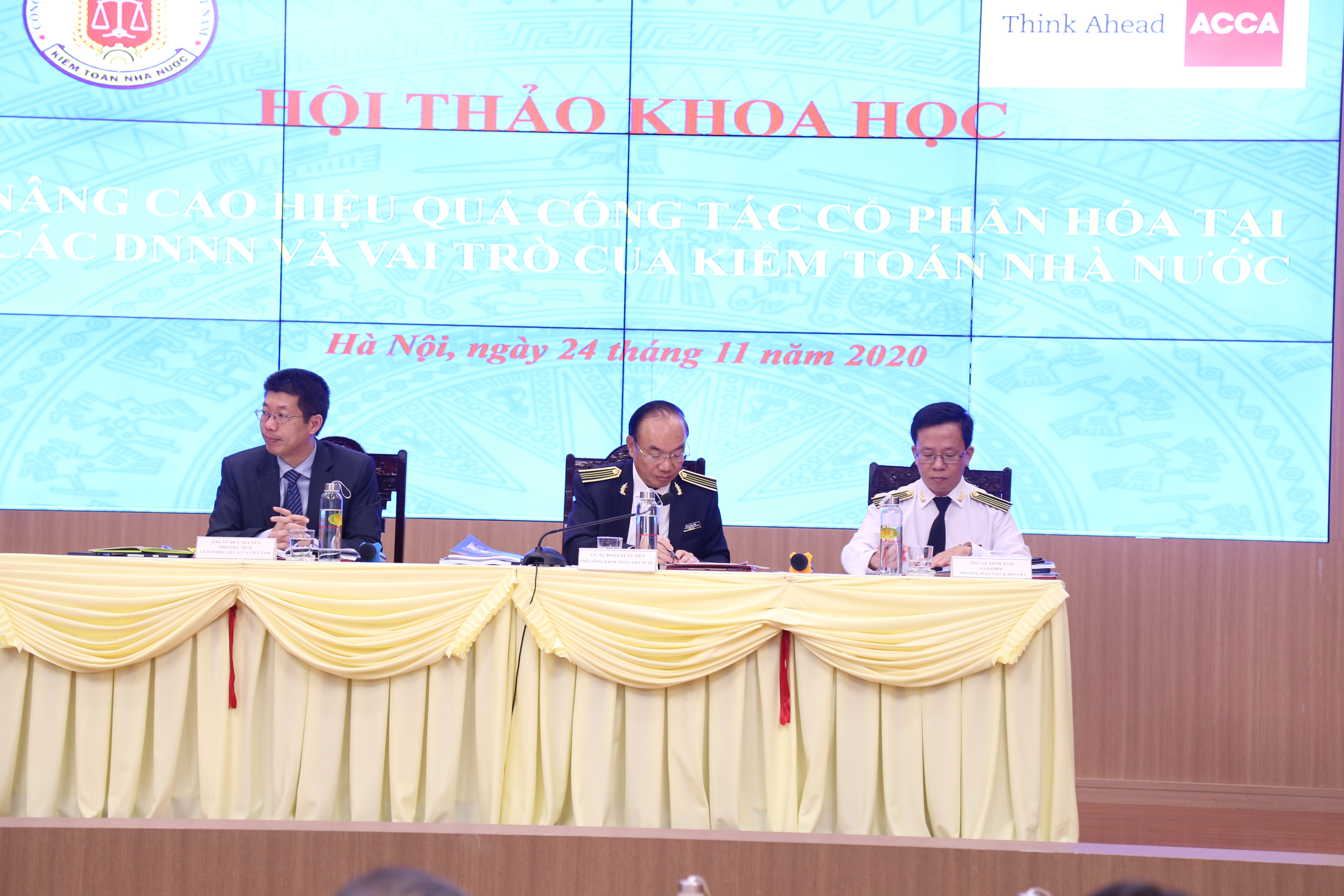 Ban chủ trì Hội thảo Cũng trong thời gian này, KTNN đã kiểm toán, quyết toán giá trị phần vốn Nhà nước tại thời điểm chính thức chuyển thành công ty cổ phần tại 45 DNNN. Hầu hết các đơn vị được kiểm toán đối chiếu, xác nhận công nợ phải thu, phải trả chưa đầy đủ; một số đơn vị chậm bàn giao tài sản, đất đai theo phương án cổ phần hóa; sử dụng đất không đúng mục đích; một số đơn vị xác định nợ phải trả không chính xác. UBND một số tỉnh, thành phố chưa có ý kiến, chậm có ý kiến hoặc chưa phê duyệt phương án sử dụng đất, giá đất; một số đơn vị chậm phê duyệt quyết toán tài chính, quyết toán số tiền thu cổ phần hóa; kết quả kiểm toán xác định tăng giá trị thực tế vốn nhà nước tại thời điểm chính thức chuyển thành công ty cổ phần tăng 1.576,96 tỷ đồng.