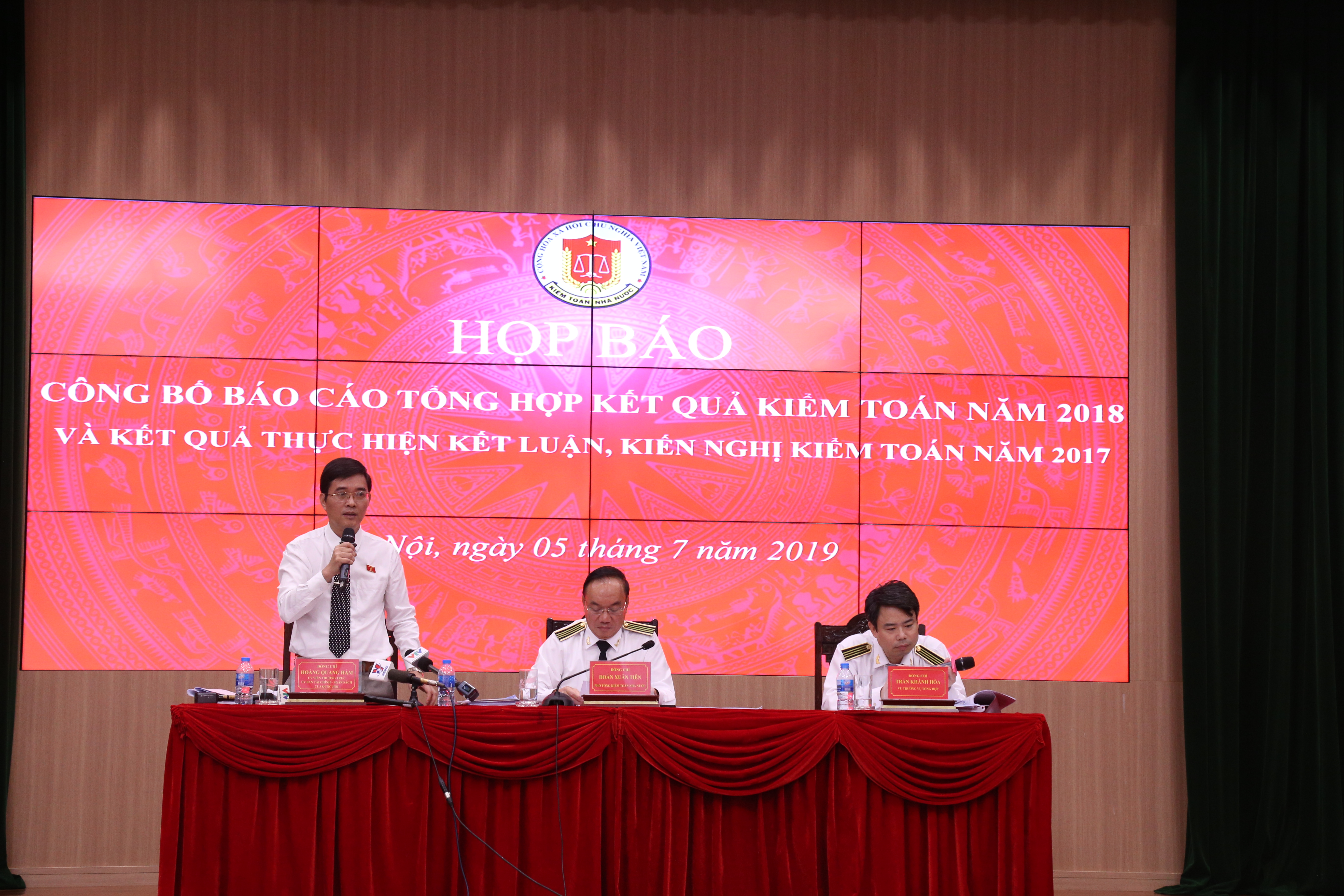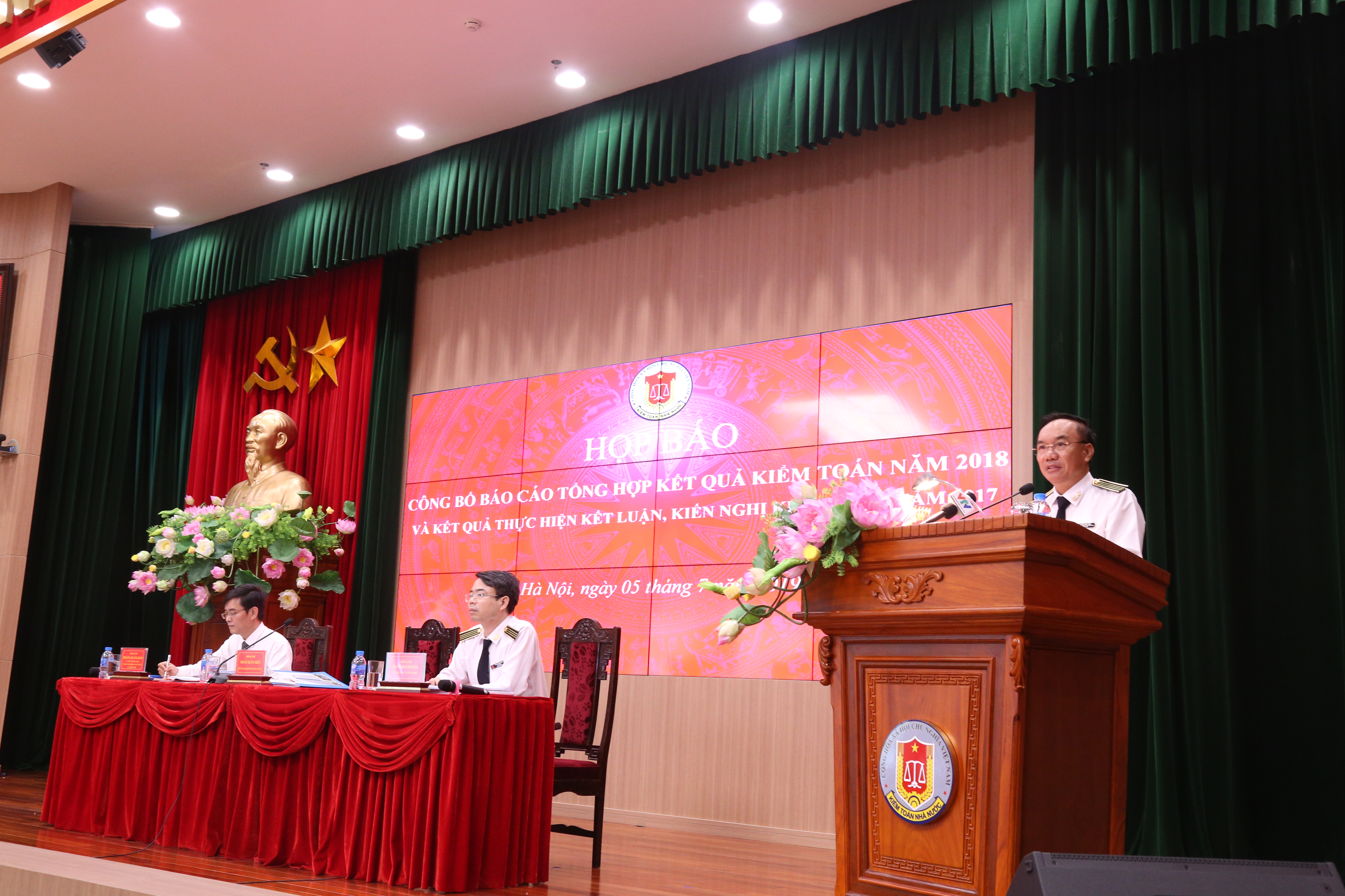 Phát biểu khai mạc buổi họp báo, Phó Tổng Kiểm toán Nhà nước Đoàn Xuân Tiên cho biết: Năm 2018, KTNN thực hiện kiểm toán đối với 212 đơn vị, đầu mối và chủ đề gồm: 17 Bộ, cơ quan Trung ương; 49 tỉnh, thành phố trực thuộc Trung ương; 09 chủ đề kiểm toán hoạt động; 22 chuyên đề; 56 dự án đầu tư; 36 DNNN và tổ chức TCNH; 22 đầu mối thuộc lĩnh vực quốc phòng, an ninh, các cơ quan đảng và kiểm toán Báo cáo quyết toán NSNN năm 2016 tại Bộ Tài chính, Bộ Kế hoạch và Đầu tư.