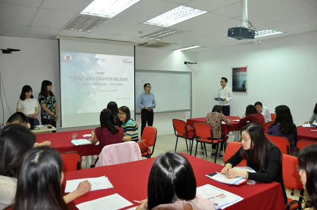 Trong thời gian tham gia lớp học, các học viên sẽ được tiếp cận 05 chuyên đề Tiếng Anh chuyên ngành: Chuyên ngành ngân hàng, tài chính, kế toán, thương mại quốc tế và kiểm toán. Trong thời gian tham gia đào tạo, các học viên sẽ có tổng cộng 06 bài kiểm tra, gồm 05 bài kiểm tra kết thúc mỗi chuyên đề và 01 bài kiểm tra đánh giá chung cuối khóa.