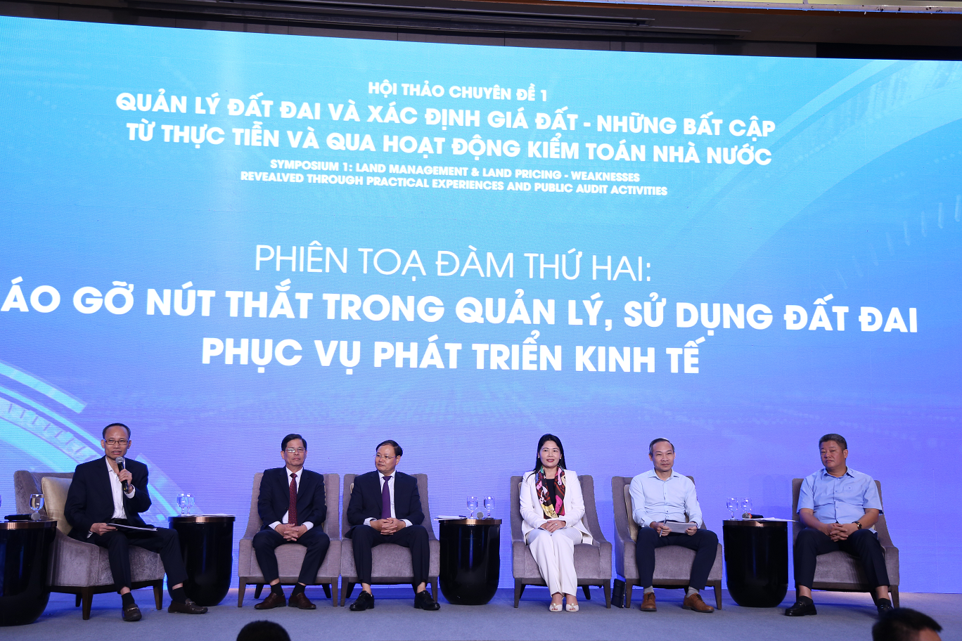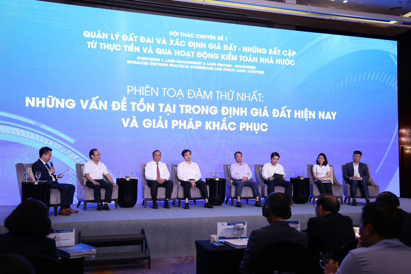 Các đại biểu tham gia Tọa đàm tại Hội thảo phiên 1 Các tham luận và ý kiến thảo luận về công tác “Quản lý đất đai và xác định giá đất” đã tập trung vào làm rõ những vấn đề lớn, cấp thiết như: Những tồn tại, vướng mắc trong quản lý, sử dụng đất đai cho phát triển hiện nay là gì. Các khó khăn, bất cập cụ thể trong công tác định giá đất, triển khai thực hiện các dự án kinh doanh bất động sản. Các giải pháp cụ thể để tháo gỡ các khó khăn, vướng mắc về thể chế và về quản lý điều hành? Qua đó, làm rõ hơn vai trò, trách nhiệm của Kiểm toán nhà nước trong phát hiện các bất cập, hạn chế và trong và kiến nghị thực hiện các giải pháp tháo gỡ khó khăn, vướng mắc để góp tiếng nói cùng các địa phương với Quốc hội, Chính phủ và các Bộ, Ngành để kịp thời chỉnh sửa, hoàn thiện cơ chế, chính sách cho phù hợp với tình hình thực tiễn đang đặt ra. Đồng thời, qua kiểm toán, cũng có những kiến nghị để xử lý nghiêm minh các hành vi vi phạm trong quản lý, sử dụng đất đai.