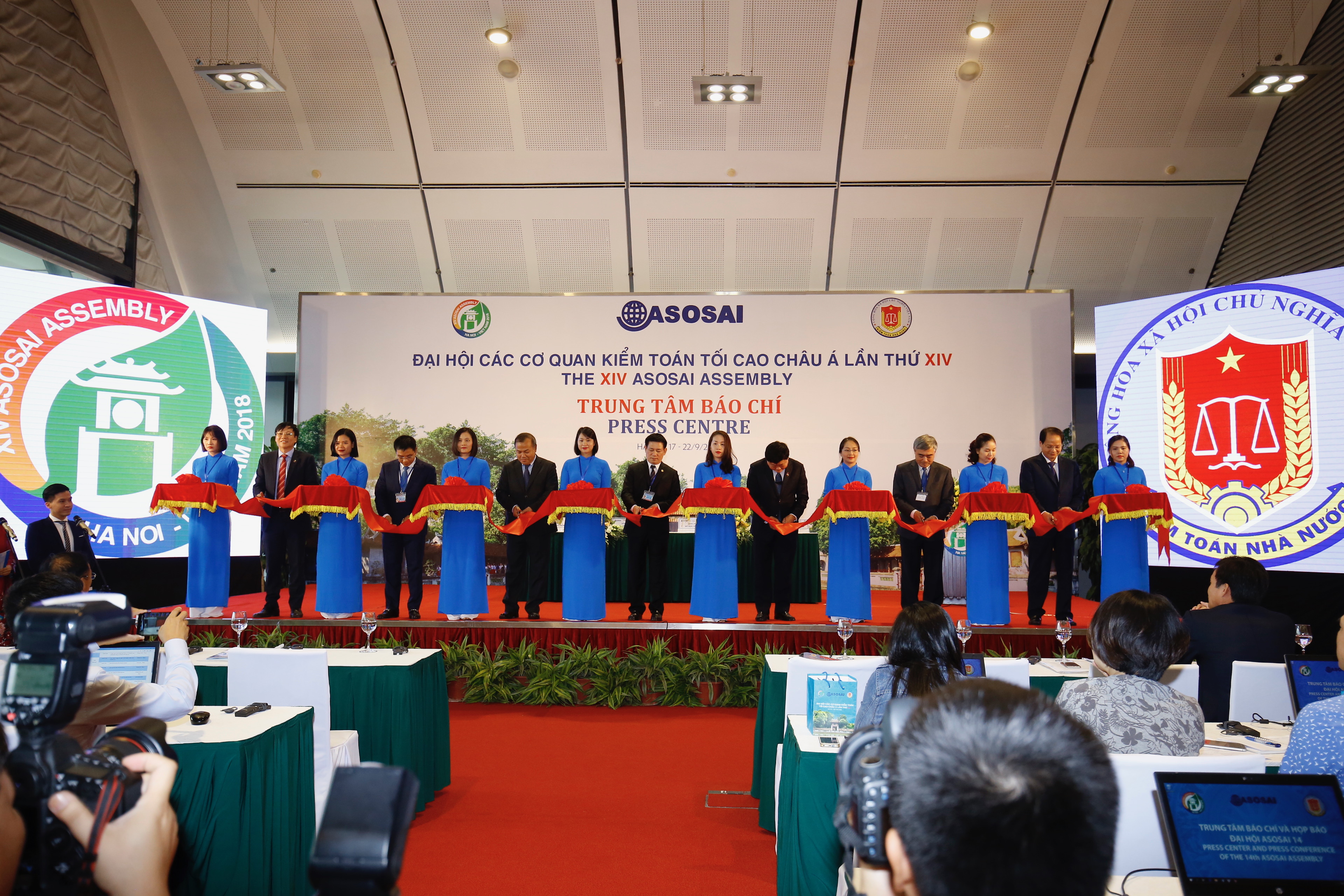 Các đại biểu cắt băng khánh thành Trung tâm báo chí ASOSAI Phát biểu tại Họp báo, Tổng KTNN Hồ Đức Phớc cho biết, đăng cai Đại hội ASOSAI 14, KTNN Việt Nam sẽ vinh dự trở thành Chủ tịch của ASOSAI nhiệm kỳ 2018-2021 và là thành viên Ban điều hành ASOSAI trong 03 nhiệm kỳ liên tiếp, từ năm 2015 đến năm 2024. Với việc lần đầu tiên được tổ chức một kỳ Đại hội ASOSAI, sự kiện chính trị - ngoại giao có ý nghĩa hết sức quan trọng này là minh chứng sinh động cho sự trưởng thành và phát triển của KTNN Việt Nam, khẳng định vị trí và vai trò của KTNN Việt Nam trong khu vực và trên thế giới; đây cũng là một cơ hội để chúng ta giới thiệu, quảng bá về hình ảnh đất nước, con người Việt Nam thân thiện năng động, hiện đại và mến khách với bạn bè quốc tế. Thành công của Đại hội sẽ góp phần quan trọng nâng cao hơn nữa hình ảnh và vị thế của KTNN Việt Nam trên trường quốc tế, ghi thêm dấu ấn tốt đẹp trong tình cảm của bè bạn quốc tế về hình ảnh đất nước và con người Việt Nam.