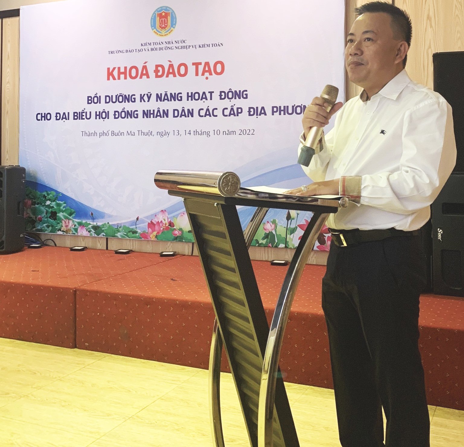 (khoahockiemtoan.vn) - Ngày 13/10/2022, tại Thành phố Buôn Ma Thuột, tỉnh Đắk Lắk,Trường Đào tạo và Bồi dưỡng nghiệp vụ kiểm toán (Trường) tổ chức khai giảng Khóa đào bồi dưỡng kỹ năng cho đại biểu HĐND các cấp địa phương. Đến dự và phát biểu tại buổi khai giảng có ông Nguyễn Huy Hoàng - Phó Giám đốc Trường, cùng các học viên.
