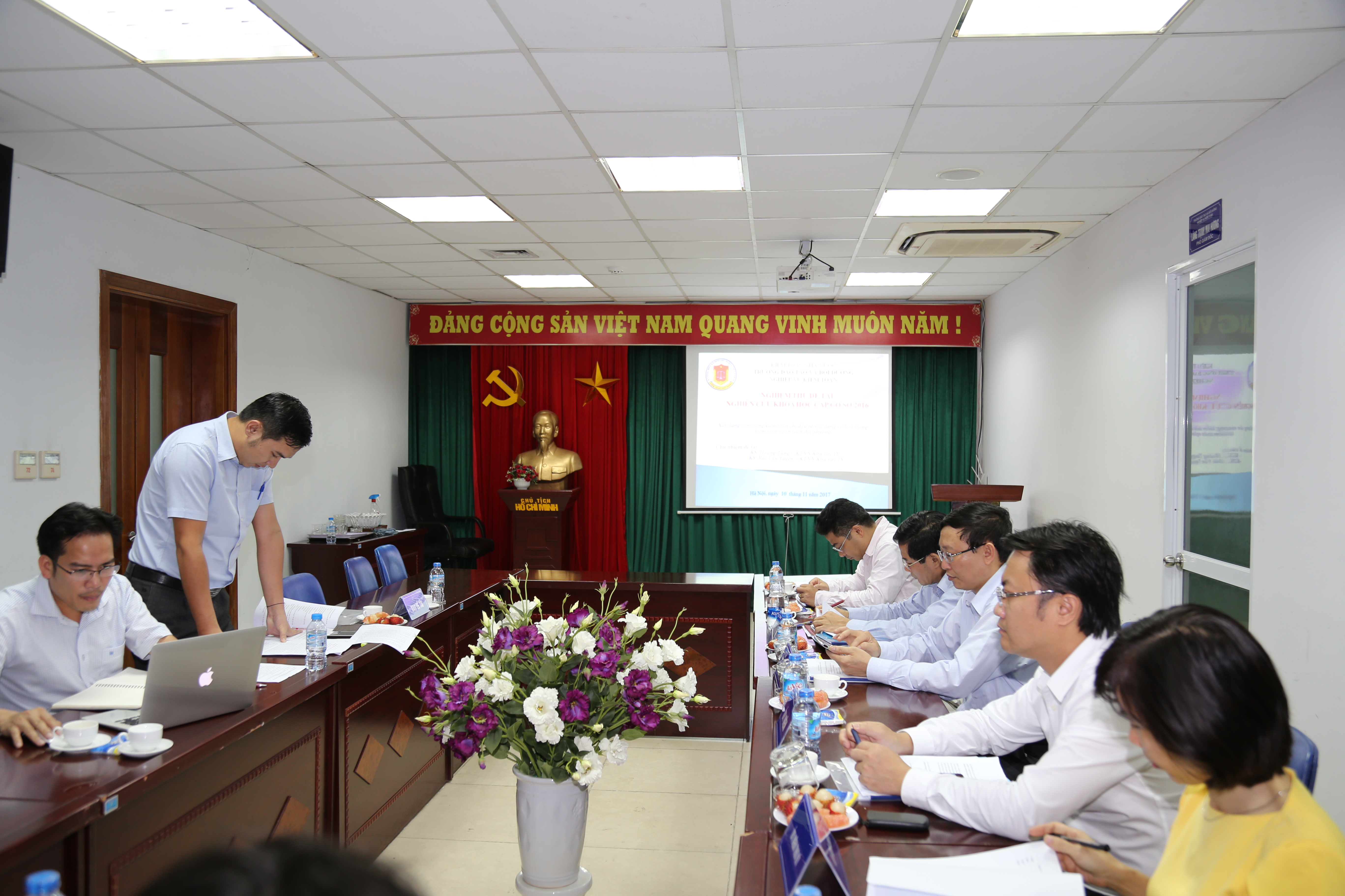 (khoahockiemtoan.vn) - Ngày 10/11/2017, tại Trường Đào tạo và Bồi dưỡng nghiệp vụ kiểm toán, Hội đồng khoa học KTNN đã tổ chức nghiệm thu đề tài nghiên cứu khoa học cấp Cơ sở: “Xây dựng cẩm nang kiểm toán chi đầu tư xây dựng cơ bản trong kiểm toán ngân sách địa phương” do KS. Hoàng Tùng và KS. Bùi Văn Tuyên làm đồng chủ nhiệm. Chủ tịch Hội đồng nghiệm thu là TS. Lê Đình Thăng – Giám đốc Trường. Tham dự buổi nghiệm thu có đầy đủ các thành viên Hội đồng nghiệm thu và các thành viên của Ban đề tài.