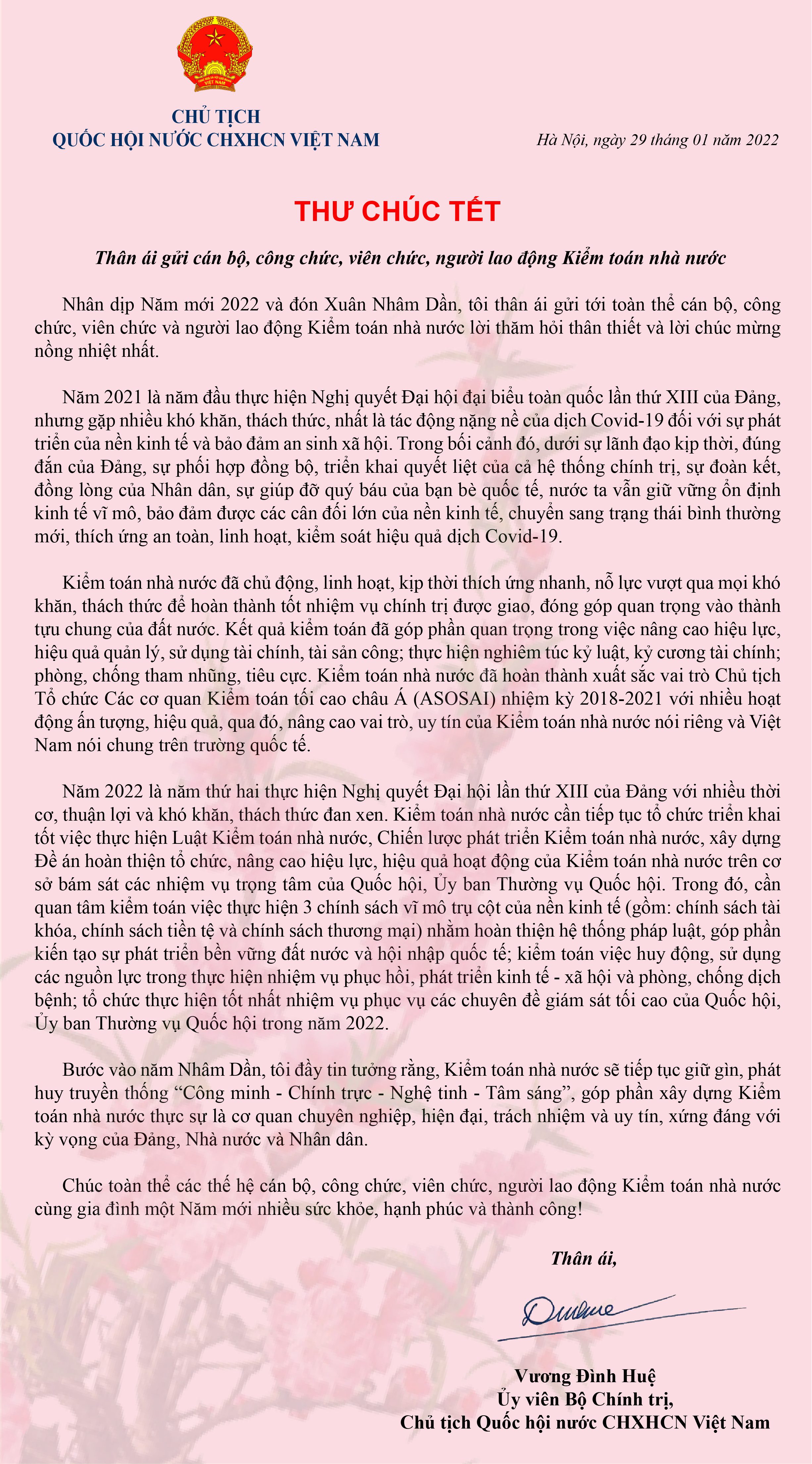Tạp chí Nghiên cứu khoa học kiểm toán trân trọng đăng toàn văn Thư chúc mừng năm mới 2022 - xuân Nhâm Dần của Chủ tịch Quốc hội Vương Đình Huệ: