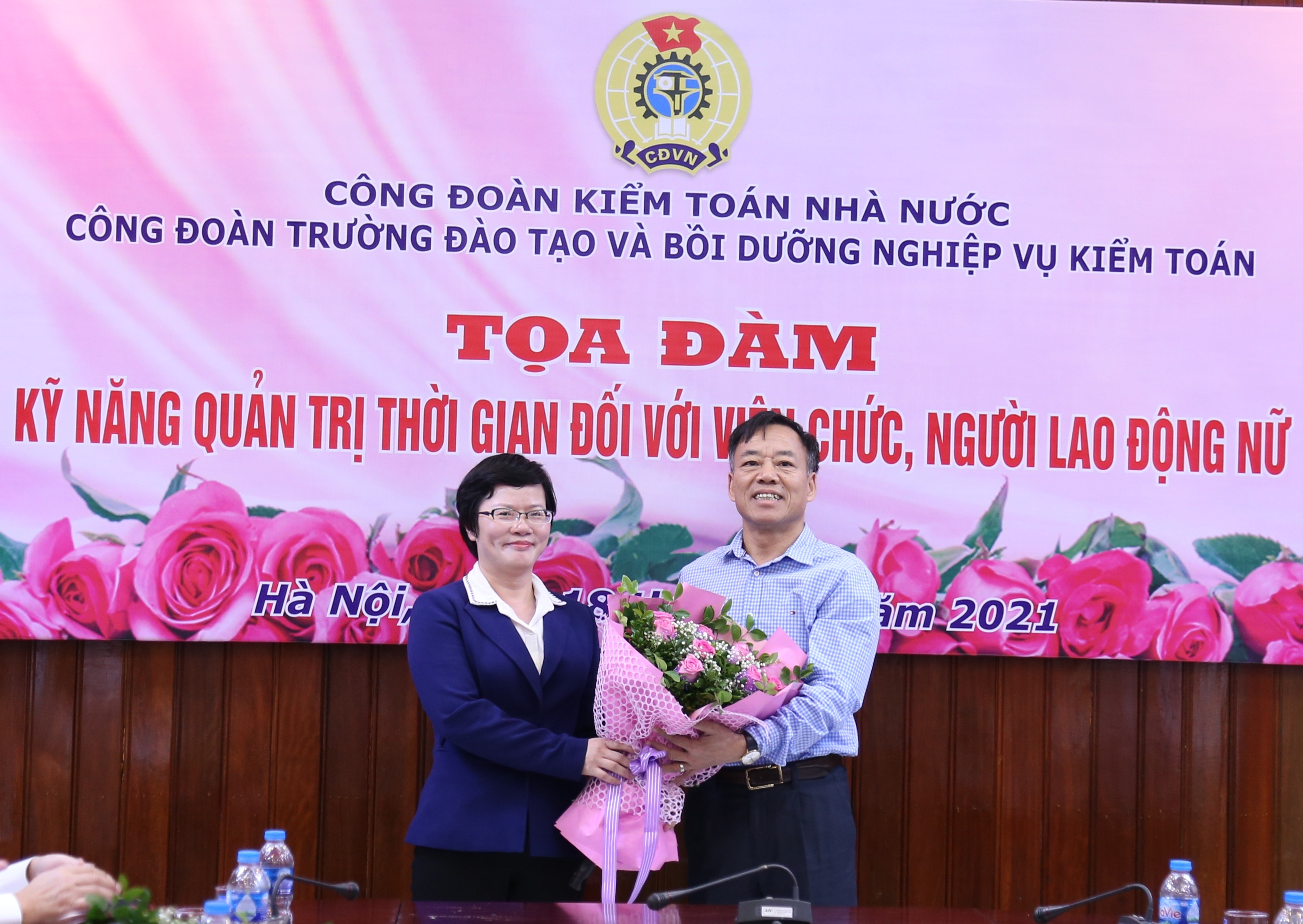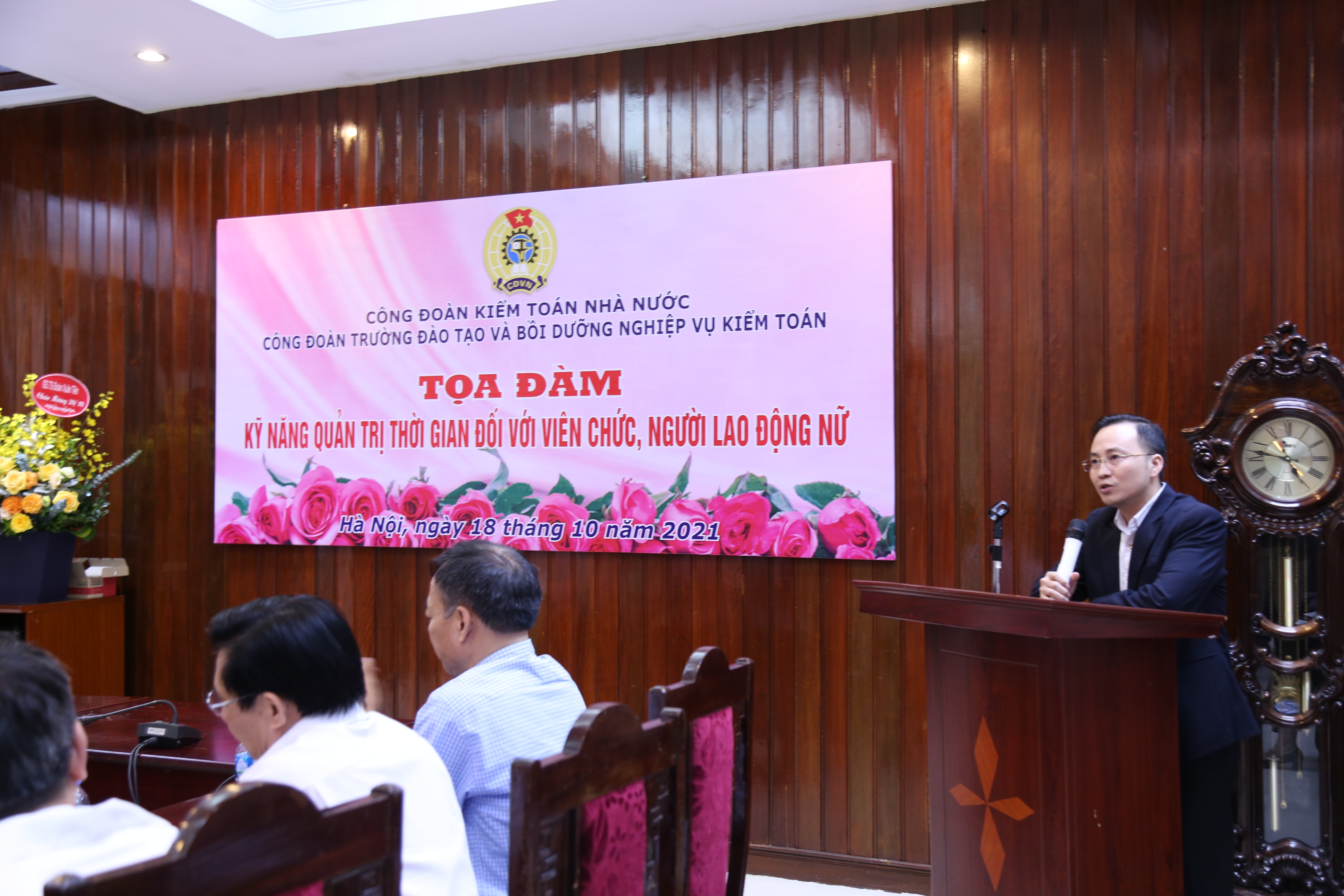 (khoahockiemtoan.vn) - Nhân kỷ niệm 91 năm Ngày phụ nữ Việt Nam (20/10/1930 - 20/10/2021), chiều ngày 18/10/2021, tại trụ sở 111 Trần Duy Hưng, Cầu Giấy Hà Nội, Trường ĐT&BD nghiệp vụ Kiểm toán tổ chức buổi Tọa đàm “Kỹ năng quản trị thời gian đối với nữ viên chức và người lao động nữ”. Đến dự buổi Tọa đàm có ông Trần Kim Lộc, Bí thư Đảng bộ - Giám đốc Trường; các đồng chí Phó Giám đốc Trường: Ngô Văn Dũng, Nguyễn Huy Hoàng, Đỗ Hồng Công, Hà Minh Tuấn; ông Vũ Lập Công - Phó Chủ tịch Công đoàn KTNN, ông Vũ Nhật Anh - Phó kiểm toán trưởng KTNN Khu vực I, cùng lãnh đạo các phòng, khoa và toàn thể chị em phụ nữ của Trường.