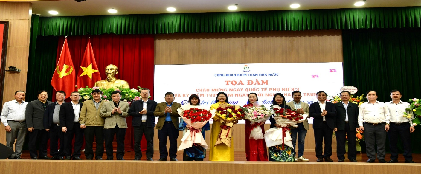 Phó Chủ tịch Thường trực Công đoàn Viên chức Việt Nam Nguyễn Văn Đông và Chủ tịch Công đoàn KTNN Trần Kim Lộc tặng hoa chúc mừng Phó Tổng Kiểm toán nhà nước Hà Thị Mỹ Dung Tham dự Tọa đàm có các đồng chí: Nguyễn Văn Đông - Phó Chủ tịch Thường trực Công đoàn Viên chức Việt Nam; Trần Kim Lộc - Ủy viên Ban Thường vụ Đảng ủy, Chủ tịch Công đoàn KTNN, Giám đốc Trường Đào tạo và Bồi dưỡng nghiệp vụ kiểm toán; Nguyễn Anh Tuấn - Chủ nhiệm Ủy ban Kiểm tra Đảng ủy, Kiểm toán trưởng KTNN khu vực I; nhà văn, nhà báo Hoàng Anh Tú.