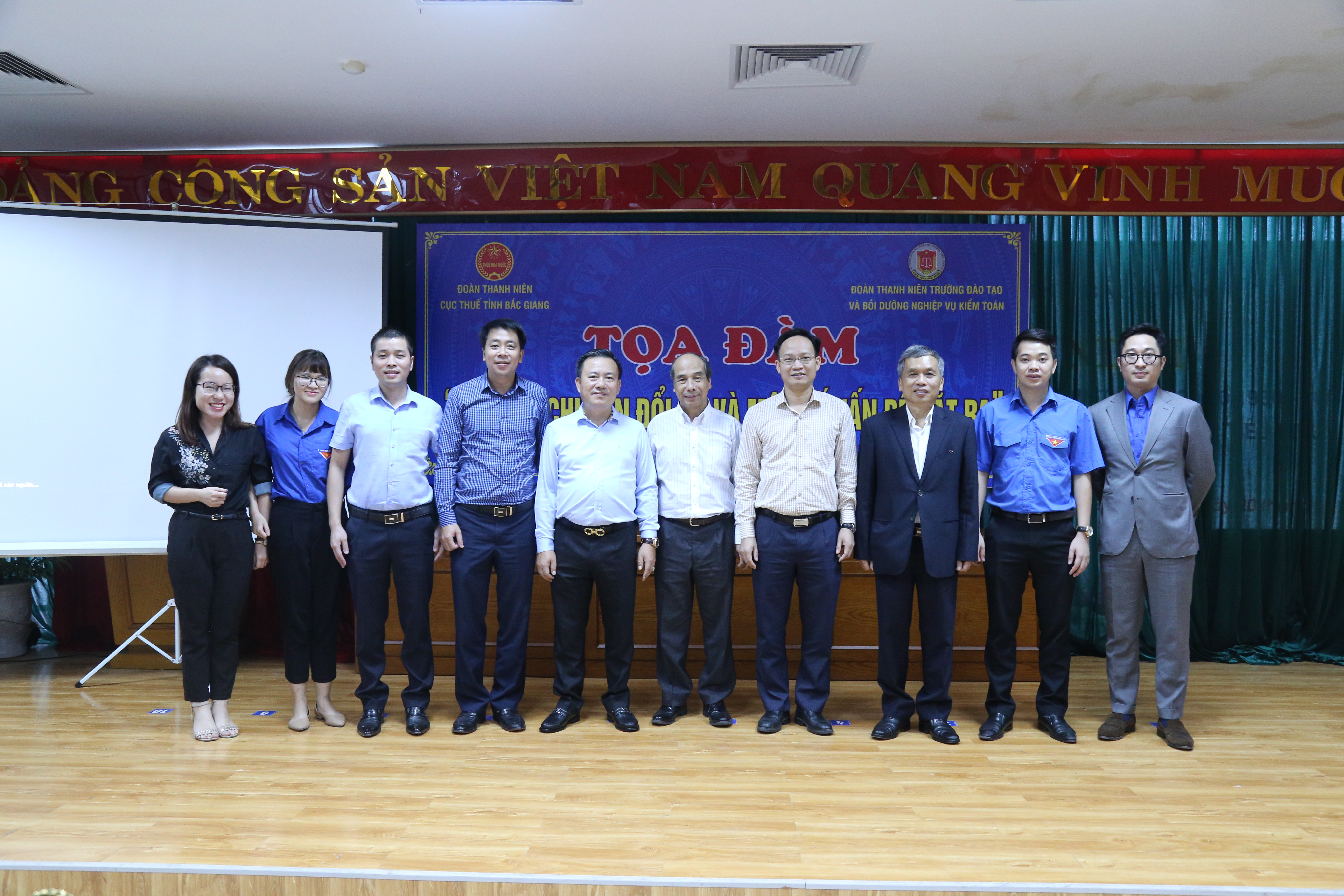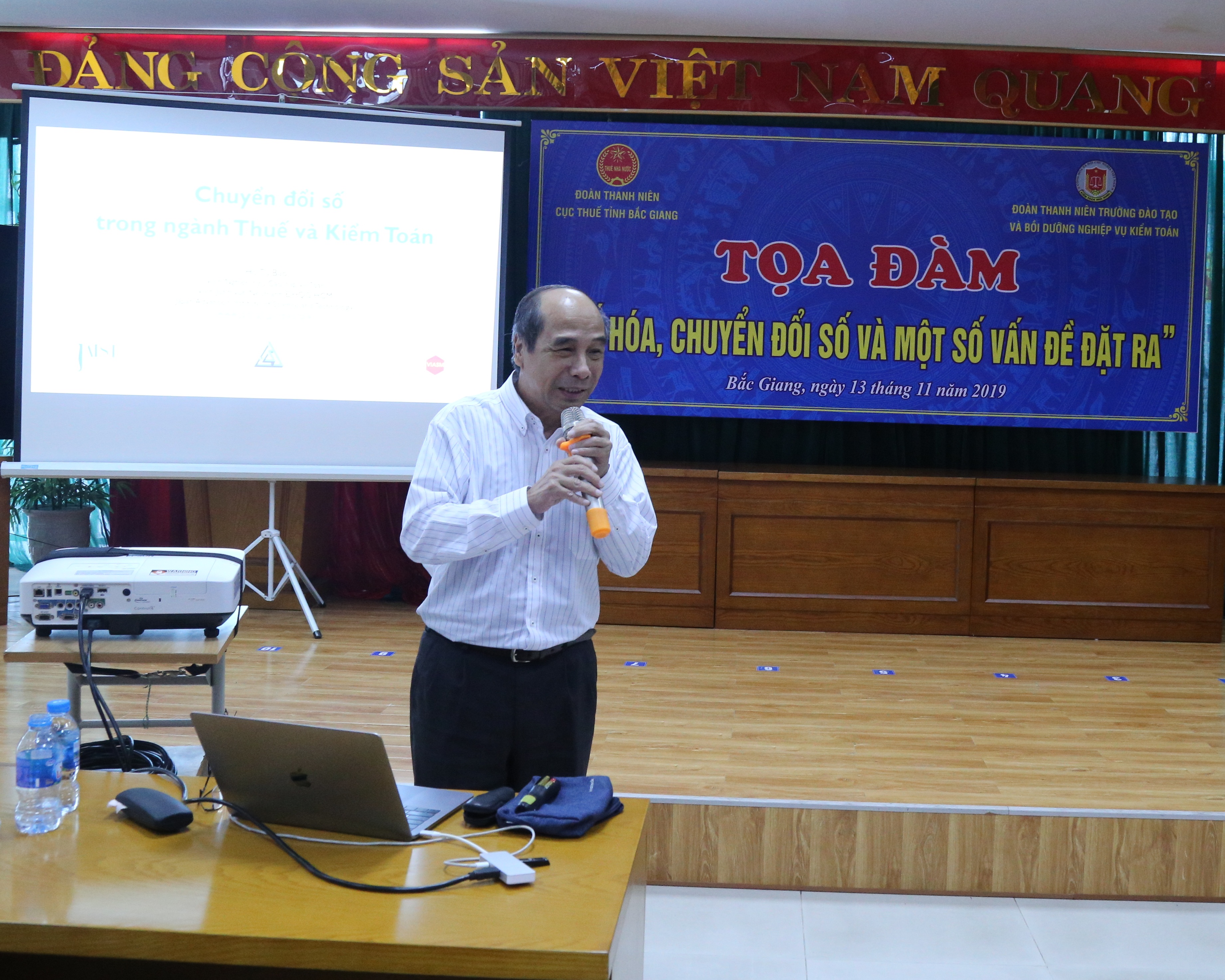 (khoahockiemtoan.vn) - Ngày 13/11/2019, tại Cục thuế tỉnh Bắc Giang, Chi đoàn Thanh niên Trường ĐT&BD nghiệp vụ Kiểm toán (Trường) đã phối hợp với Chi đoàn Cục thuế tỉnh Bắc Giang tổ chức buổi Tọa đàm “Số hóa, chuyển đổi số và một số vấn đề đặt ra”. Tham dự buổi Tọa đàm có ông Nguyễn Huy Hoàng - Phó Giám Trường, TS. Lê Đình Thăng - Kiểm toán trưởng KTNN Chuyên ngành III, Trưởng ban Tuyên giáo Đảng ủy KTNN; PGS.TS Nguyễn Đình Hòa - Nguyên Quyền Giám đốc Trường; ông Phạm Văn Thịnh – Cục trưởng, ông Đỗ Văn Minh, Phó Cục trưởng Cục thuế tỉnh Bắc Giang; bà Mai Thi Hồng Nhung đại diện Đoàn các cơ quan tỉnh Bắc Giang cùng các đoàn viên thanh niên của hai chi đoàn. GS.TSKH Hồ Tú Bảo - Viện nghiên cứu cao cấp về Toán và Viện John Von Neumann, Đại học Quốc Gia Thành phố Hồ Chí Minh làm diễn giả của buổi Tọa đàm.