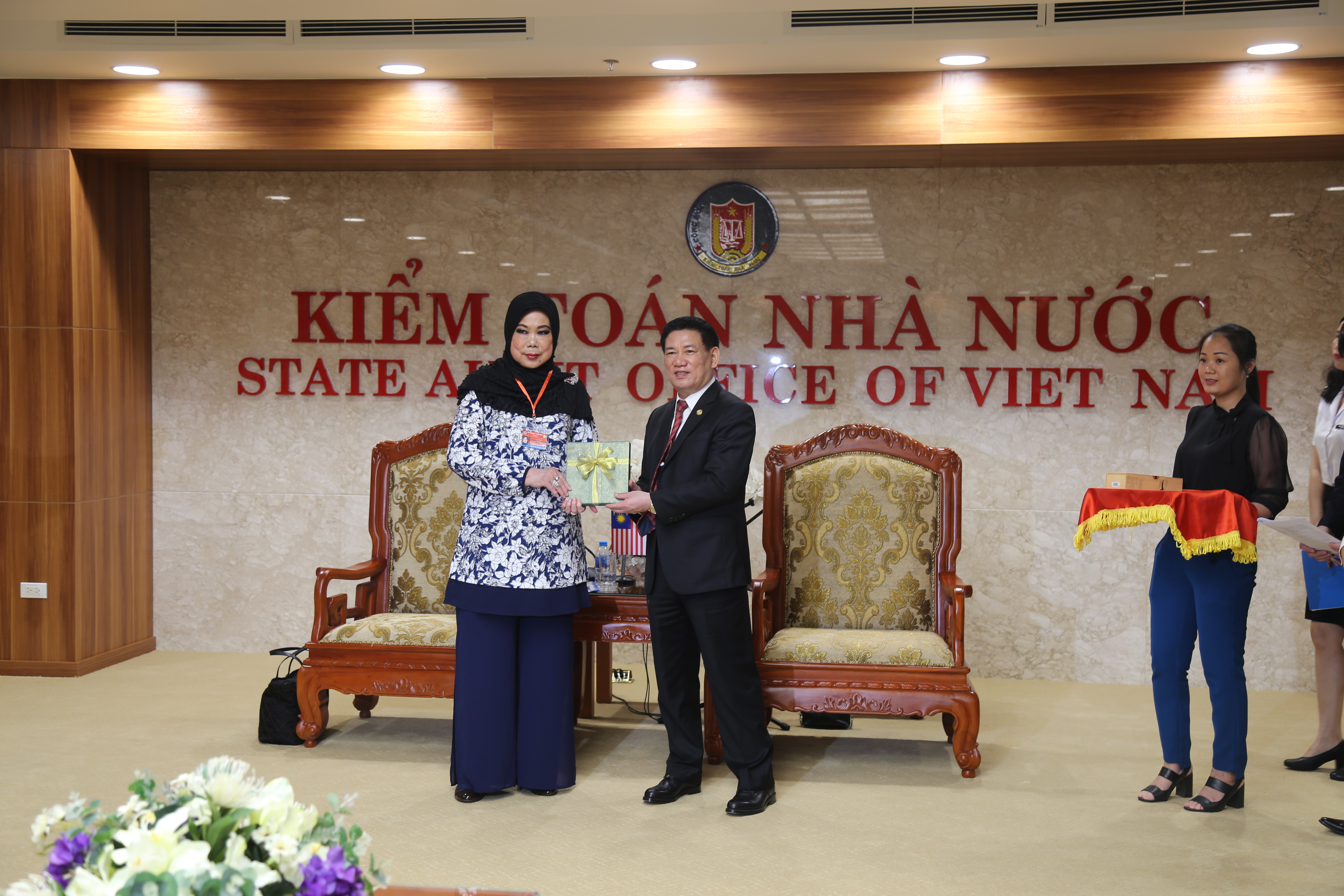 Tổng KTNN Việt Nam tặng quà lưu niệm cho Tổng KTNN Maylaysia.