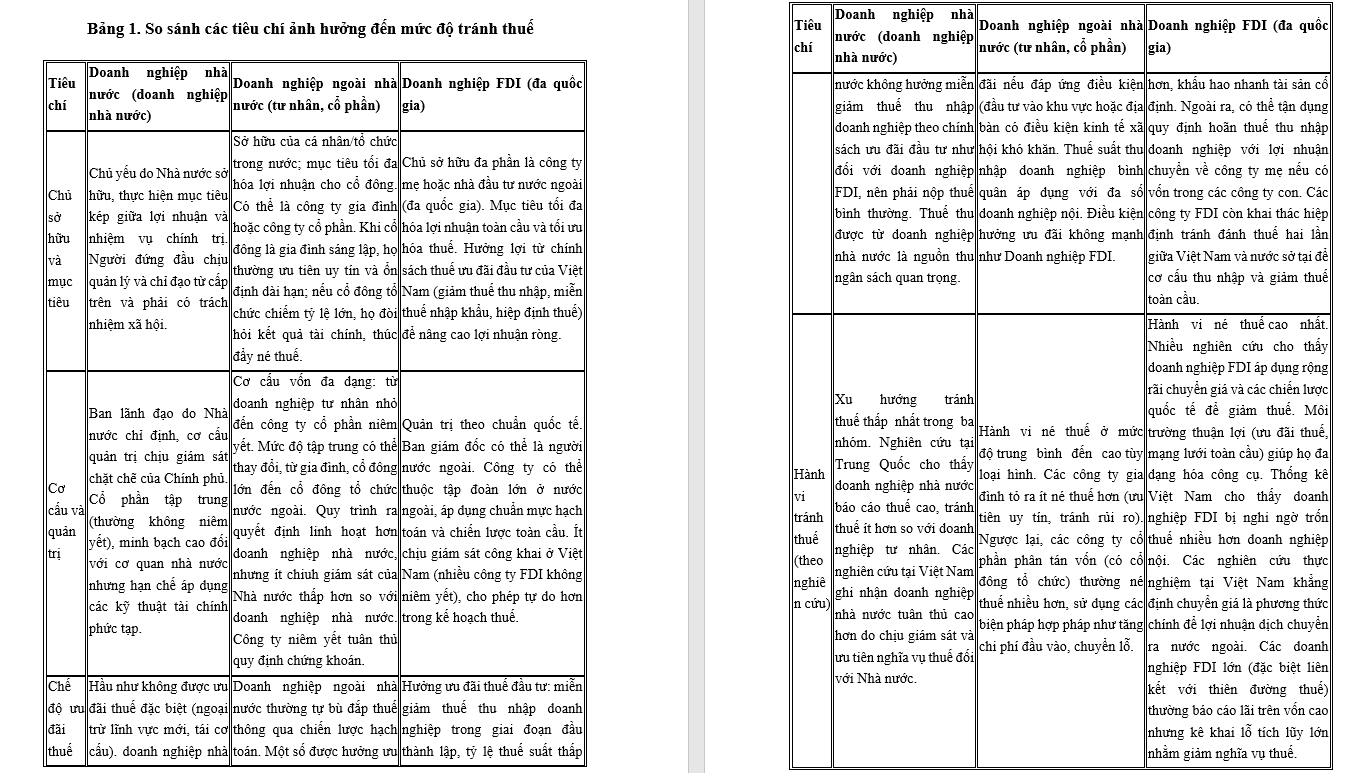 Các nghiên cứu định lượng khác cho thấy các công ty FDI liên kết với thiên đường thuế mới có dấu hiệu điều chỉnh thu nhập để hưởng lợi suất thuế và thường chỉ xuất hiện ở các công ty có quy mô lớn [12]. Ngoài ra, Luật Thuế thu nhập doanh nghiệp Việt Nam cho phép doanh nghiệp FDI được khấu trừ nhiều loại chi phí nội bộ (như chi phí bản quyền, phí vay nội bộ) nếu có hợp đồng hợp lệ; một số công ty lợi dụng quy định này kê khai giá nguyên liệu cao hơn thực tế hoặc phí dịch vụ nội bộ để lỗ giả, giảm thuế. Kết quả là, doanh nghiệp FDI tại Việt Nam thường có tỷ suất lợi nhuận trước thuế cao nhưng báo cáo lỗ dài hạn (ví dụ: có doanh nghiệp FDI duy trì ROE rất cao nhưng ghi lỗ tích lũy hàng nghìn tỷ đồng), gây thất thu lớn cho ngân sách. Bảng 1 tóm tắt đặc điểm và xu hướng tránh thuế chính của ba loại hình doanh nghiệp. Ví dụ, các nghiên cứu cho thấy sự khác biệt quan trọng: doanh nghiệp nhà nước ít né thuế nhất, doanh nghiêp tư nhân/cổ phần ở giữa (mức độ phụ thuộc cấu trúc sở hữu) và doanh nghiệp FDI né thuế nhiều nhất.