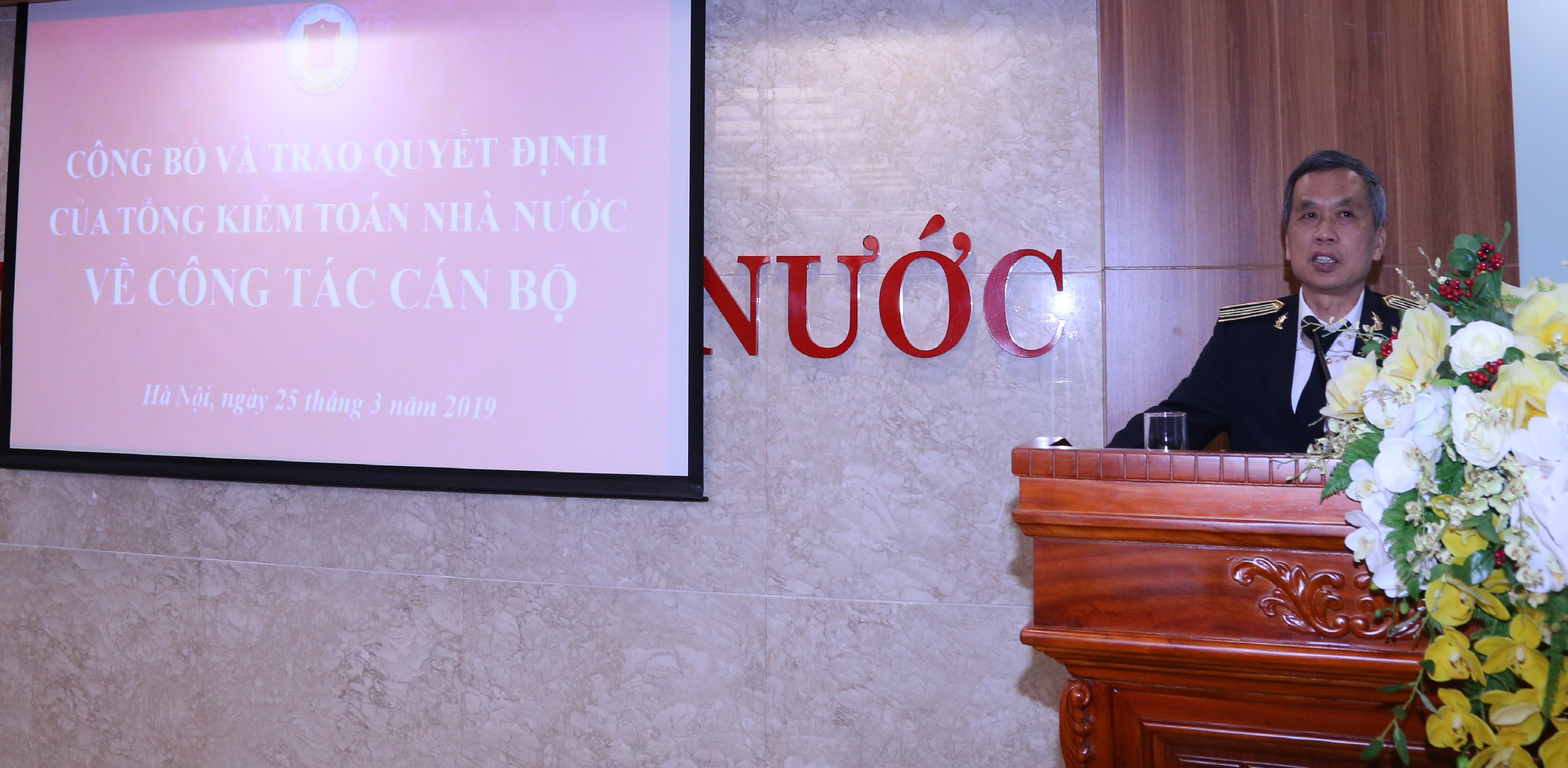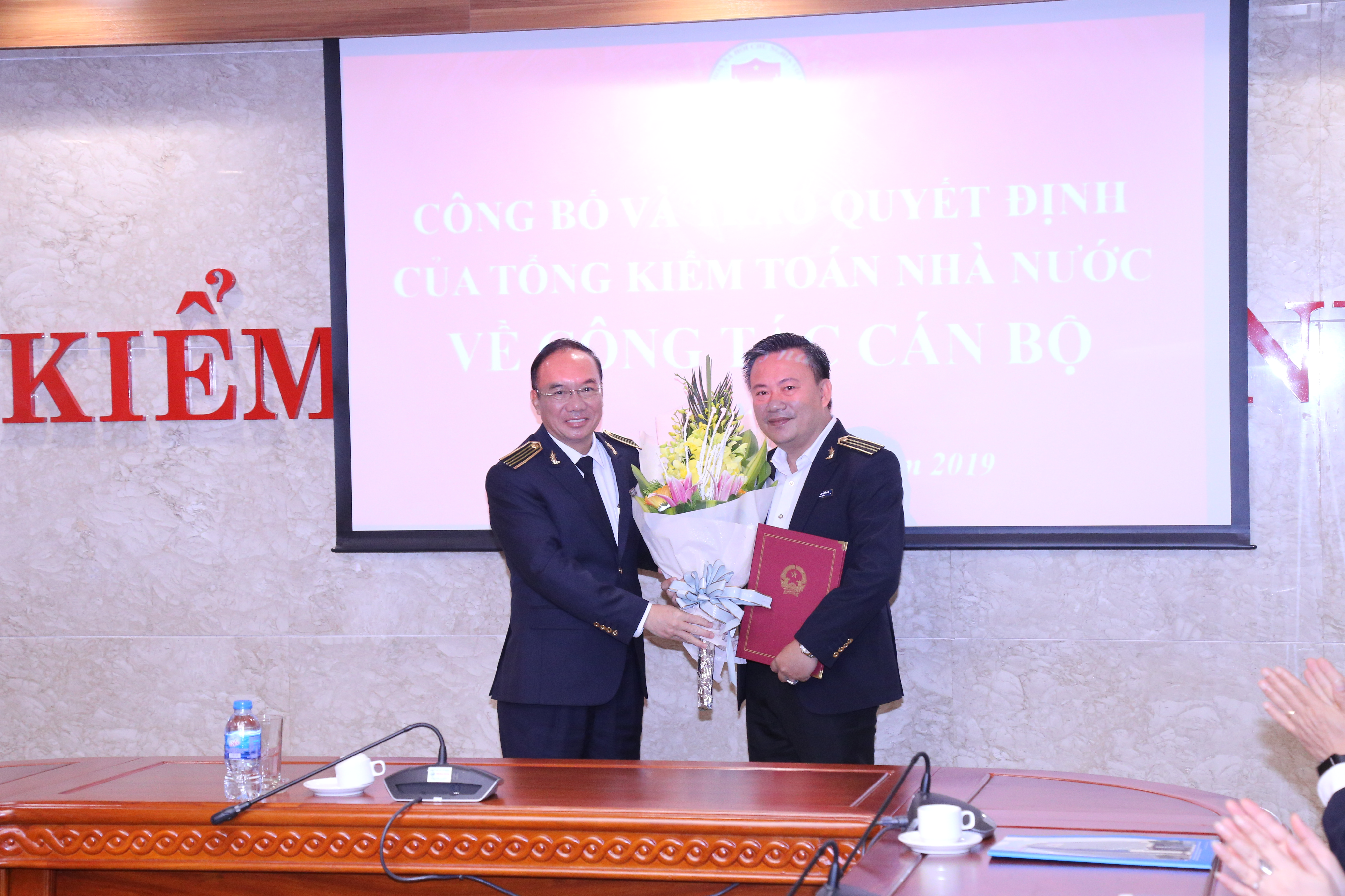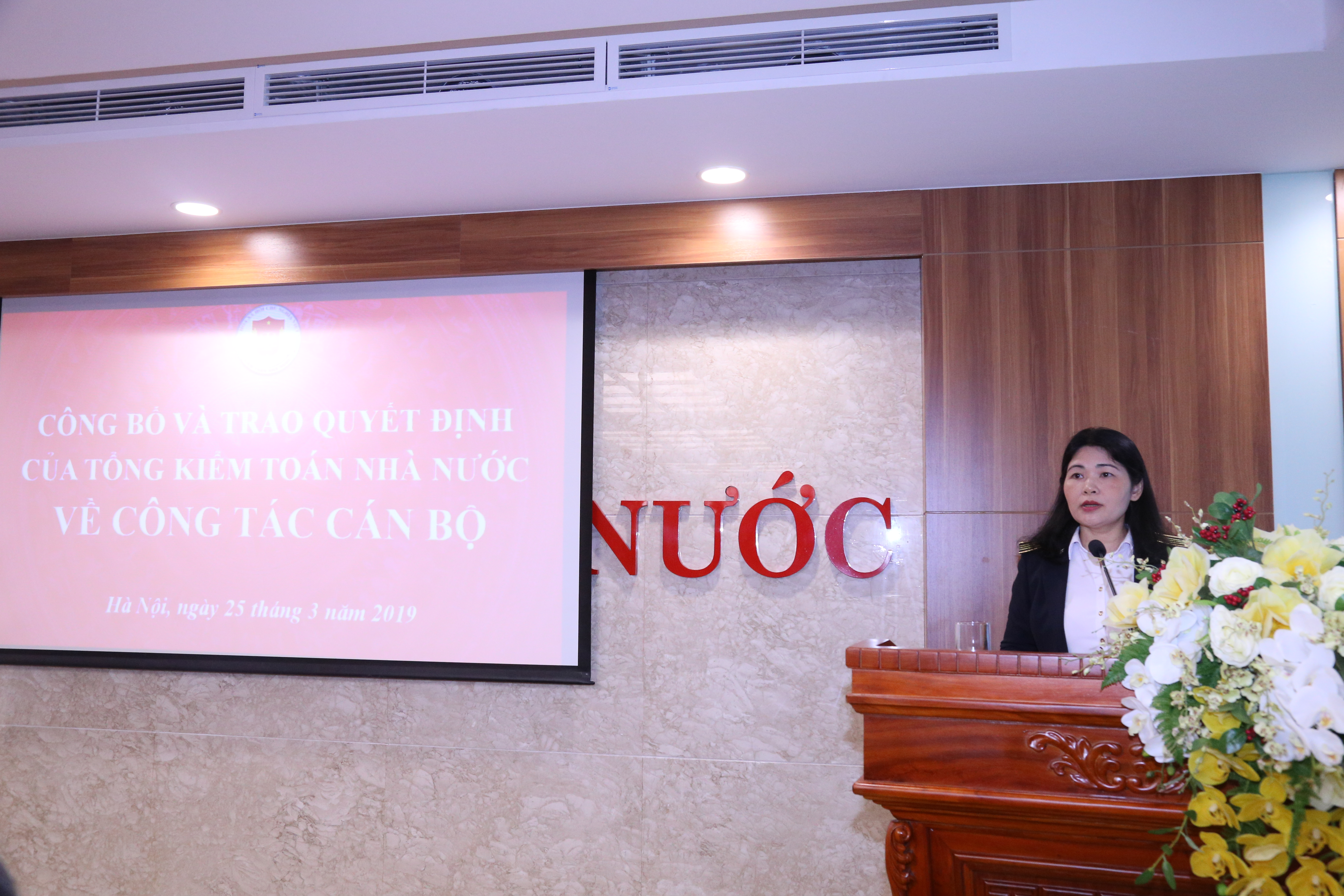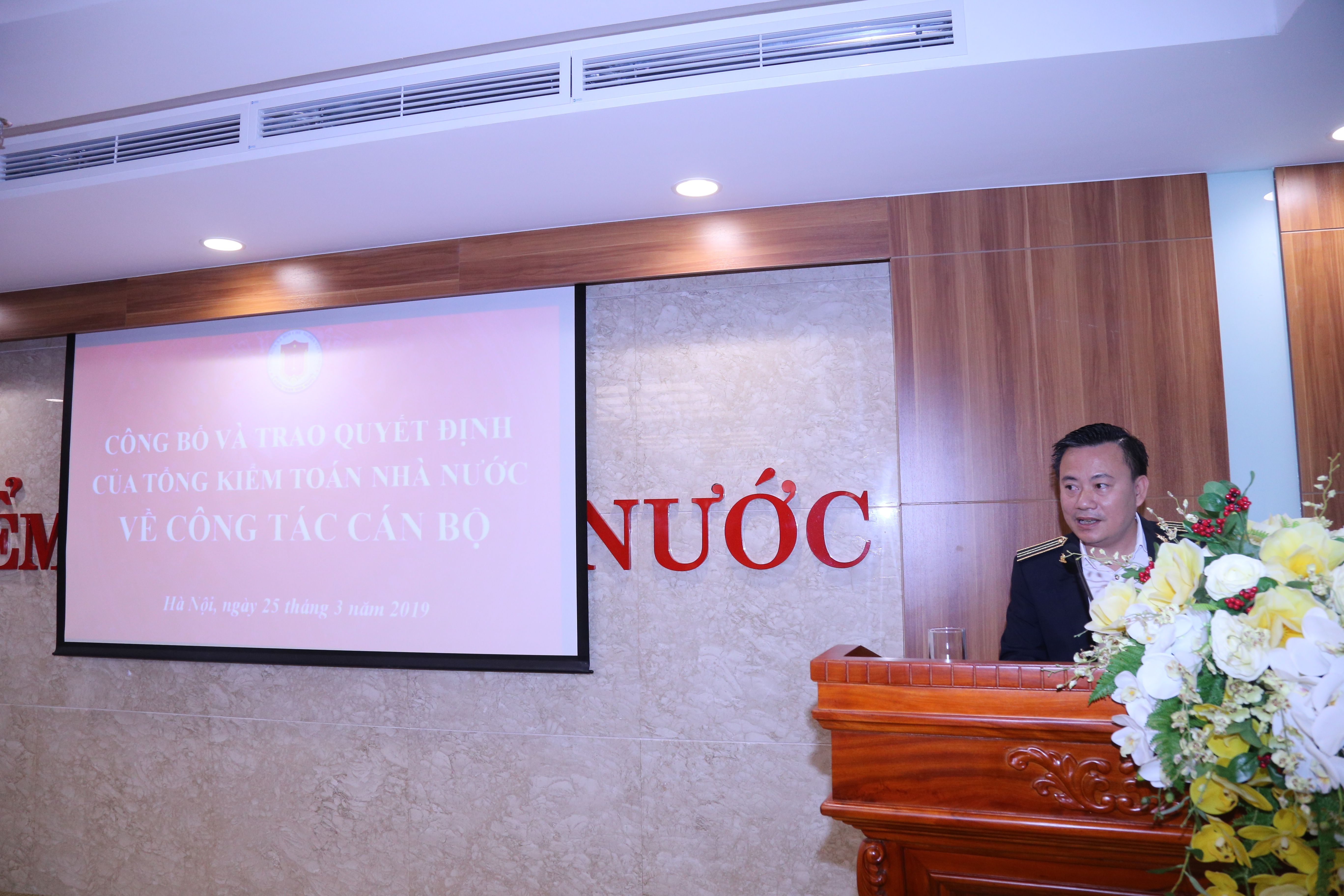 Tại buổi Lễ, Bà Hà Thị Mỹ Dung - Vụ Trưởng Vụ Tổ chức Cán bộ đã công bố Quyết định số 438/QĐ-KTNN ngày 14/3/2019 của Tổng KTNN điều động và bổ nhiệm ông Nguyễn Huy Hoàng Phó Giám đốc Trung tâm Tin học đến nhận công tác và bổ nhiệm giữ chức vụ Phó Giám đốc Trường ĐT&BD nghiệp vụ kiểm toán.