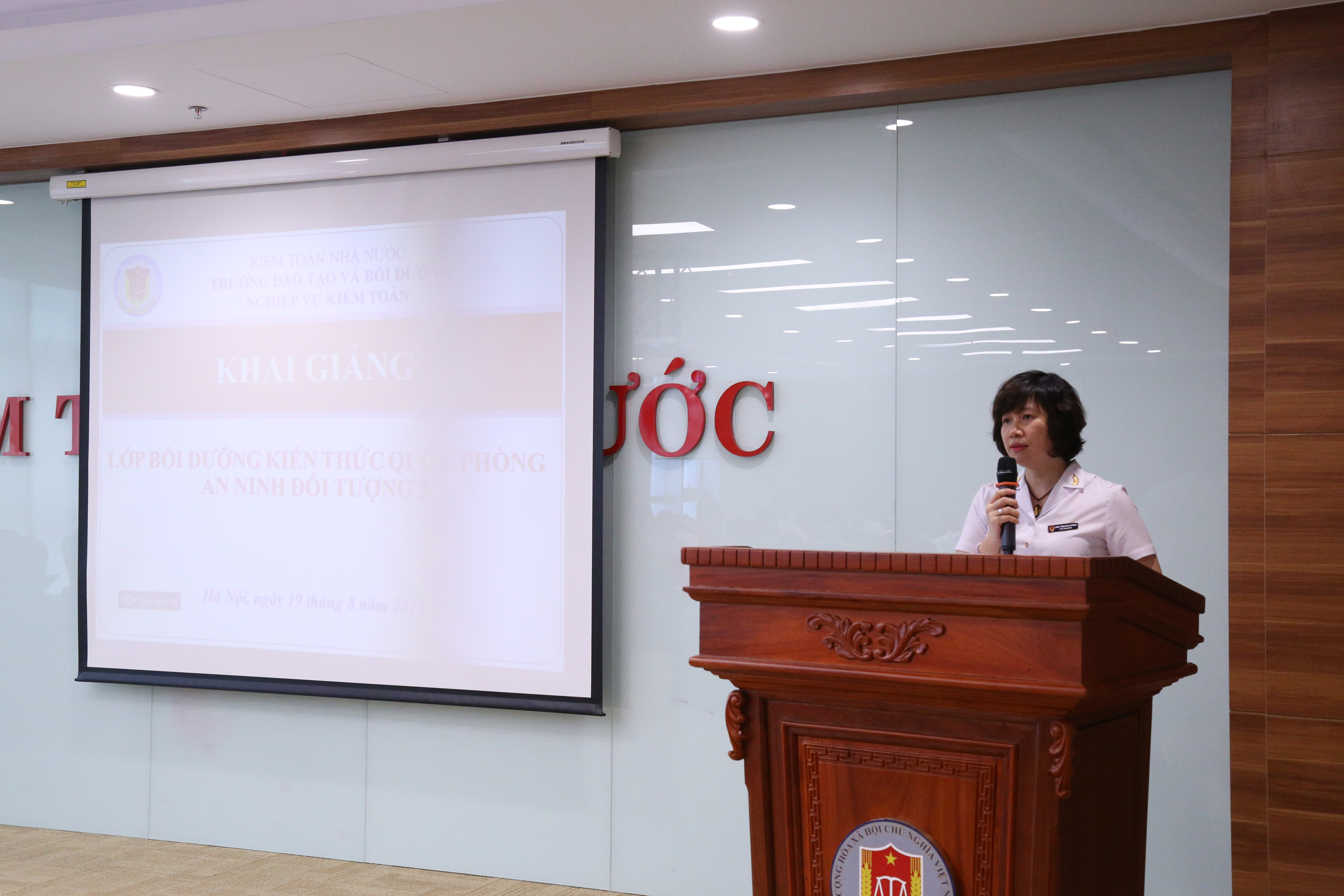 Phát biểu tại buổi Lễ khai giảng bà Lăng Trịnh Mai Hương - Phó Giám đốc Trường cho biết: Đối với Kiểm toán viên, ngoài việc phải hiểu biết chuyên sâu về kiến thức chuyên môn thì việc hiểu biết về kinh tế, chính trị,  xã hội, đặc biệt là vấn đề an ninh, quốc phòng là rất quan trọng, nhất là trong giai đoạn hiện nay khi các mạng xã hội ngày càng phát triển và công nghệ thông tin bùng nổ. Qua khóa học này ,sẽ giúp cho mỗi học viên  nhận thức sâu sắc hơn về tình hình an ninh quốc phòng của nước ta hiện nay, nhận diện rõ hơn các thế lực thù địch đang ngày đêm chống phá con đường phát triển, đi lên CNXH mà Đảng, Nhà nước và nhân dân ta đã dày công vun đắp, để phục vụ tốt cho việc thực hiện nhiệm vụ của mỗi người. Nhân dịp này,  Phó giám đốc Trường chúc các học viên sức khỏe, tập trung học tập tốt để hoàn thành tốt khóa học.