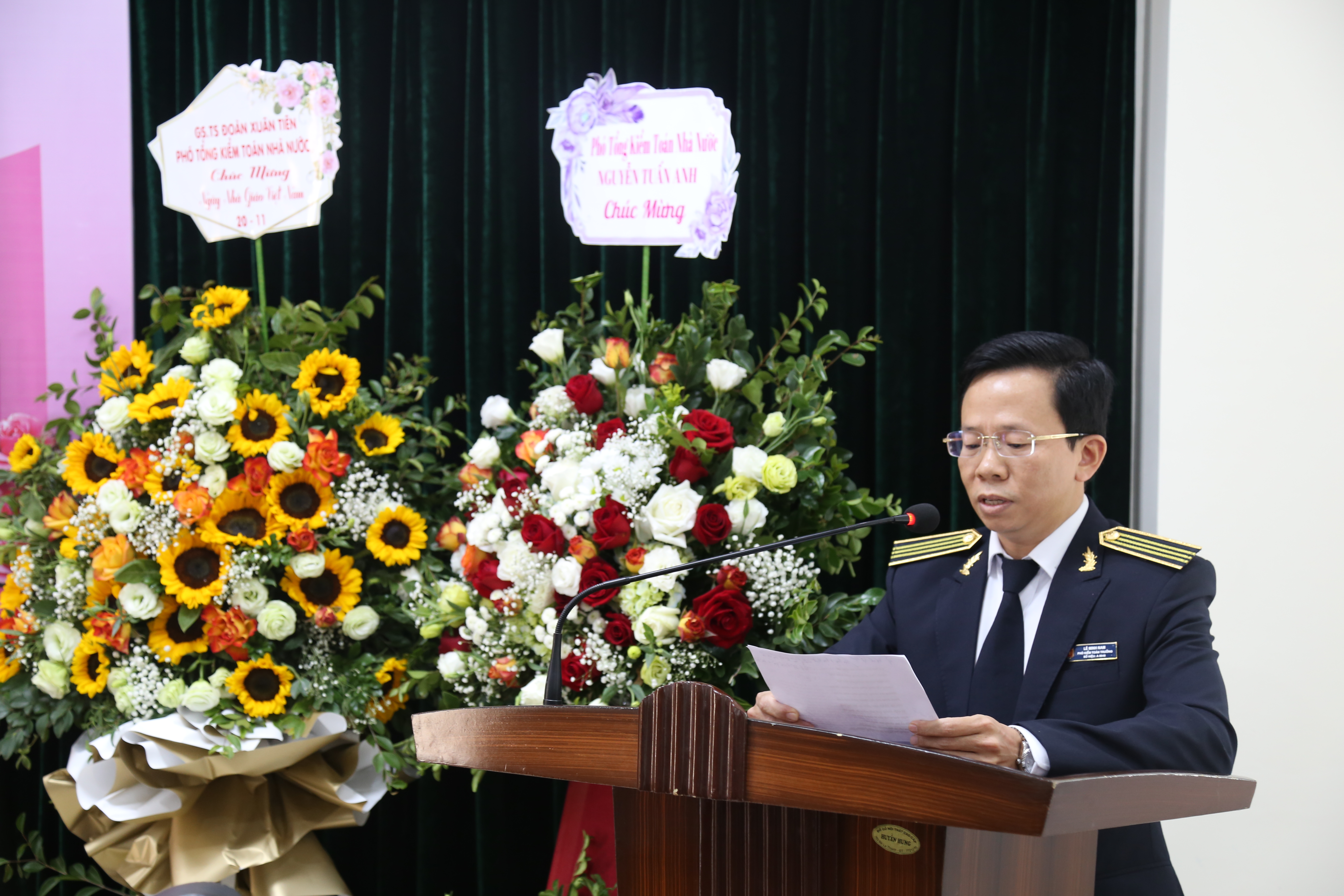 Thay mặt Lãnh đạo và toàn thể viên chức người lao động của Trường Giám đốc Trường Lê Minh Nam cảm ơn sự quan tâm của Lãnh đạo KTNN, lãnh đạo các đơn vị trong Ngành, các đồng chí nguyên là lãnh đạo Trường đã nghỉ hưu và các quý vị đại biểu đã đến tri ân và chúc mừng cán bộ, viên chức của Trường đối với sự nghiệp trồng người. Giám đốc Trường xin hứa sẽ cùng Ban Giám đốc, cấp ủy và tập thể viên chức, người lao động của Trường luôn cố gắng, nỗ lực để thực hiện tốt hơn nữa vai trò, nhiệm vụ được giao, đáp ứng kỳ vọng của lãnh đạo, các đơn vị trực thuộc KTNN để nâng cao chất lượng công tác giảng dạy, đào tạo của Trường trong thời gian tới.