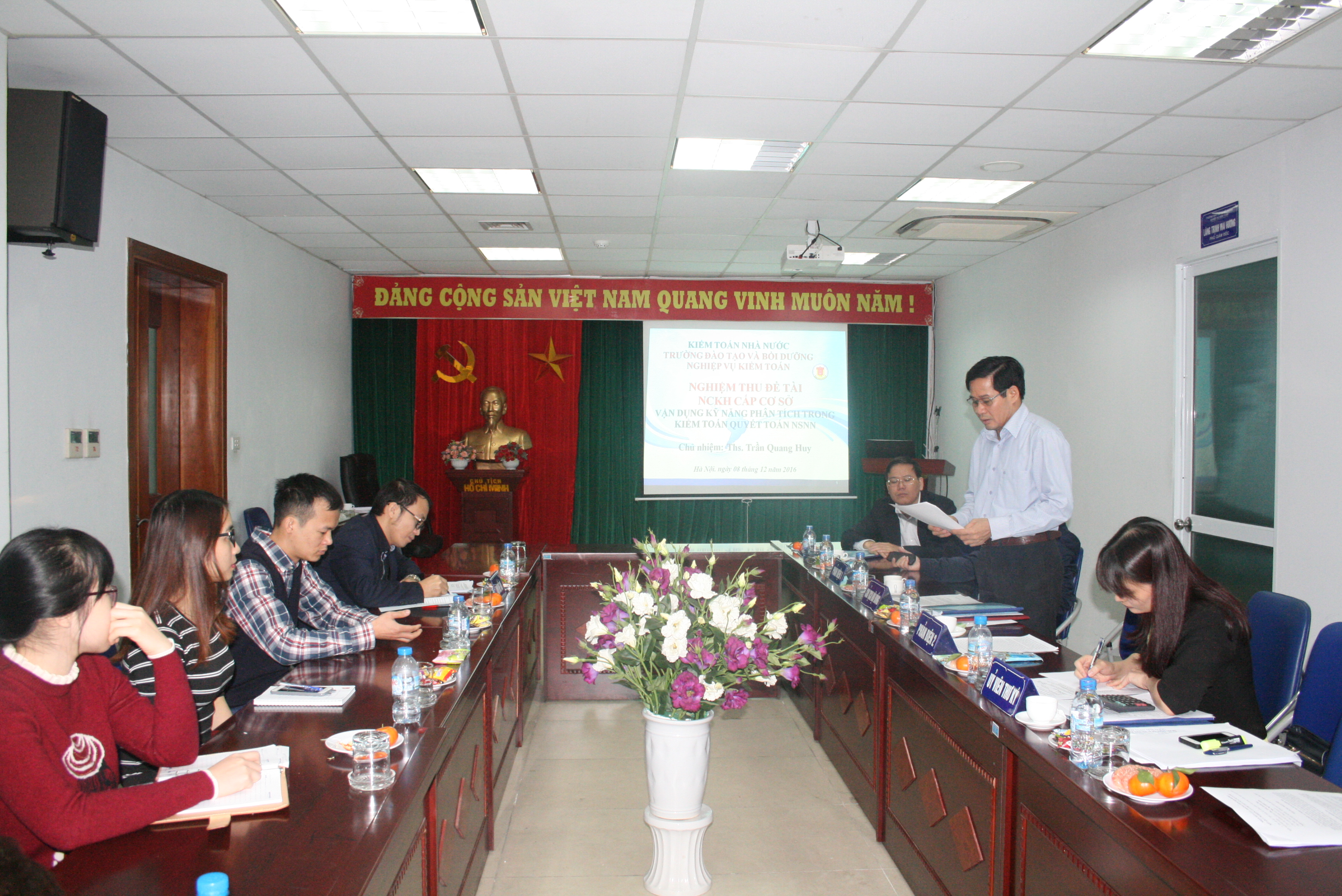 Tại buổi nghiệm thu Ths. Trần Quang Huy đã báo cáo tóm tắt về tình hình nghiên cứu Đề tài, nội dung chính của Đề tài để Hội đồng xem xét và cho ý kiến phản  biện. Theo ban Đề tài, trong những năm qua, công tác kiểm toán quyết toán NSNN của Kiểm toán nhà nước đã dần được nâng cao, quy trình và phương pháp kiểm toán ngày càng được hoàn thiện. Trong bối cảnh hoạt động tài chính - ngân sách liên tục phát triển, đa dạng và phong phú gắn với nhiều chủ thể quản lý, sử dụng khác nhau, cuộc kiểm toán quyết toán NSNN có thành công hay không tùy thuộc vào việc áp dụng các thủ tục kiểm toán phù hợp.